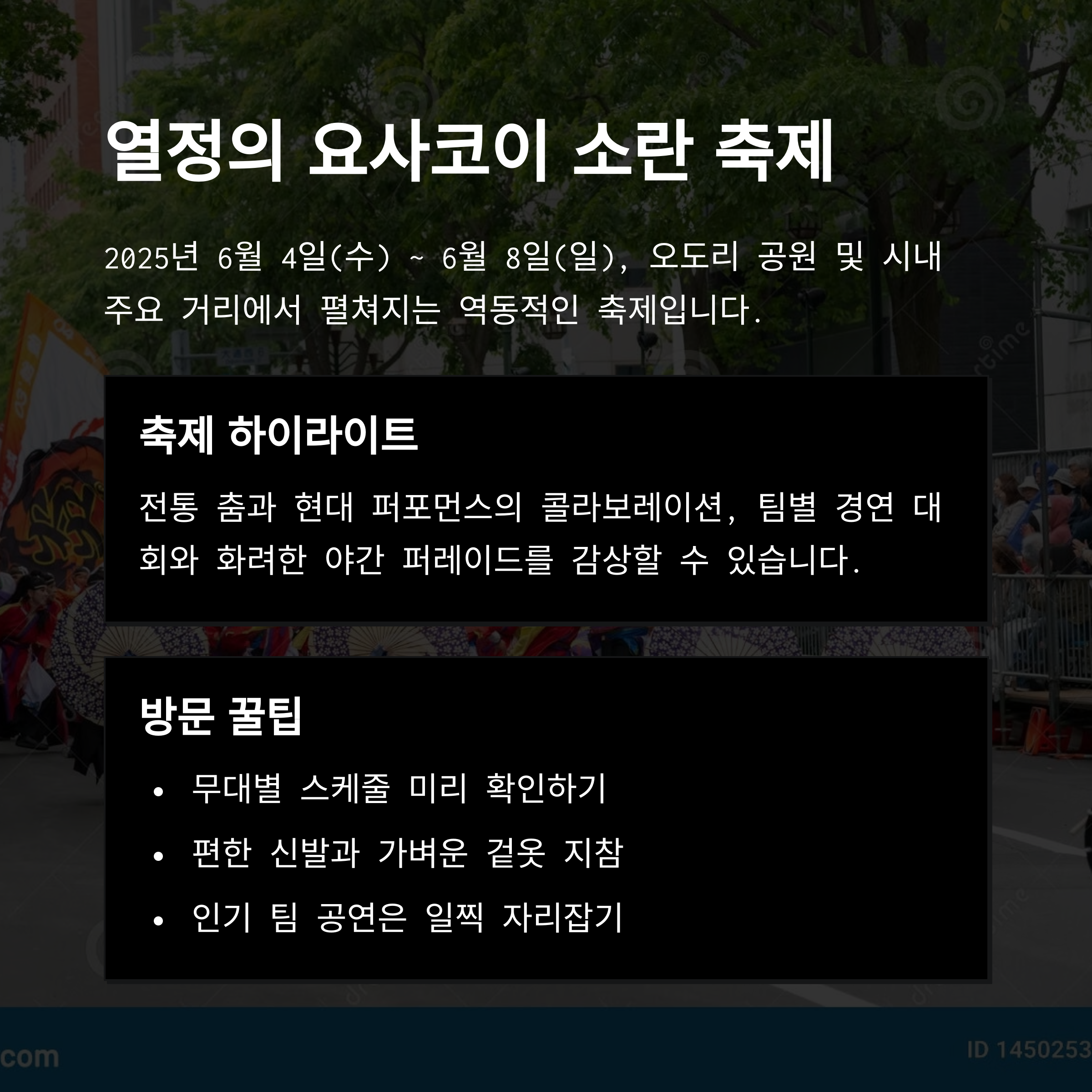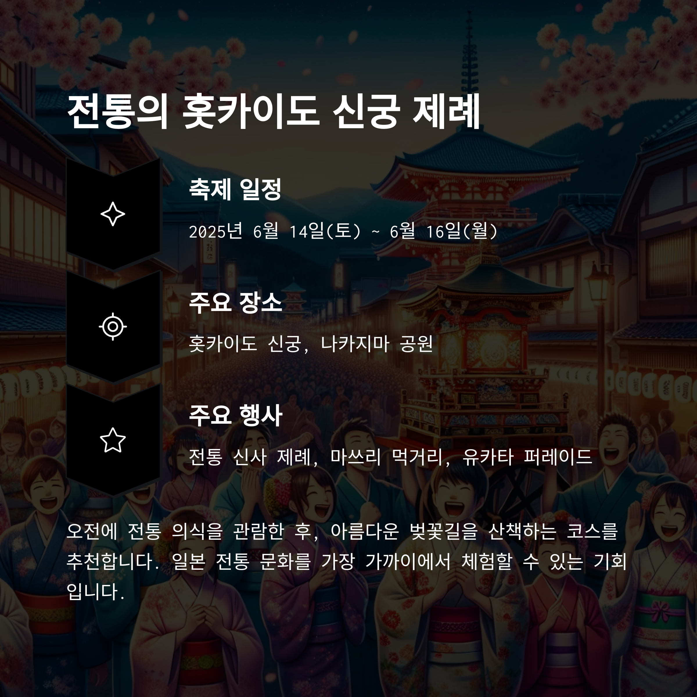 - 내용: 전통 신사 제례·마쓰리 먹거리·유카타 퍼레이드