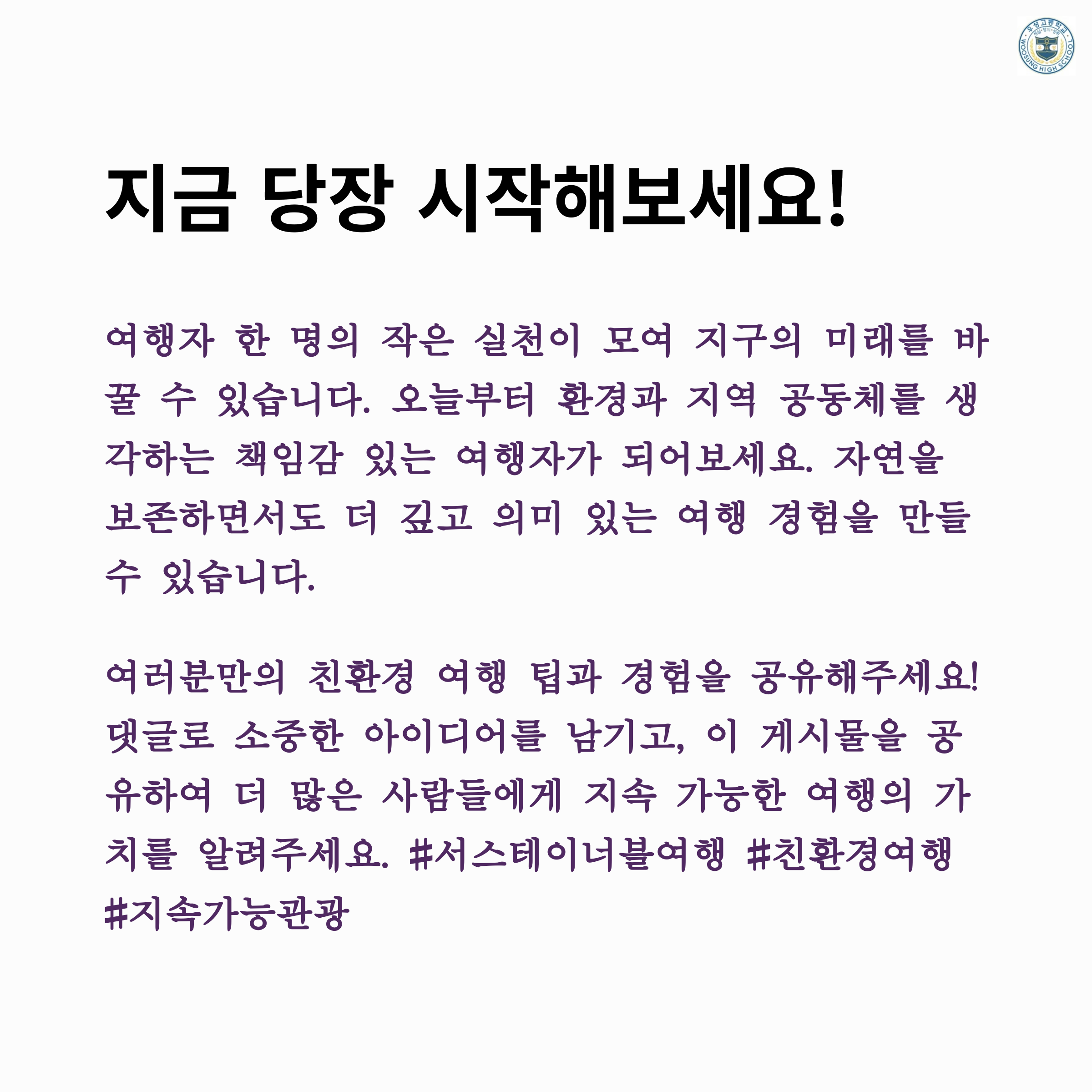 서스테이너블 투어리즘은 단순한 트렌드가 아니라, 우리가 더 나은 세상에서 살기 위해 반드시 실천해야 하는 방법이죠.
