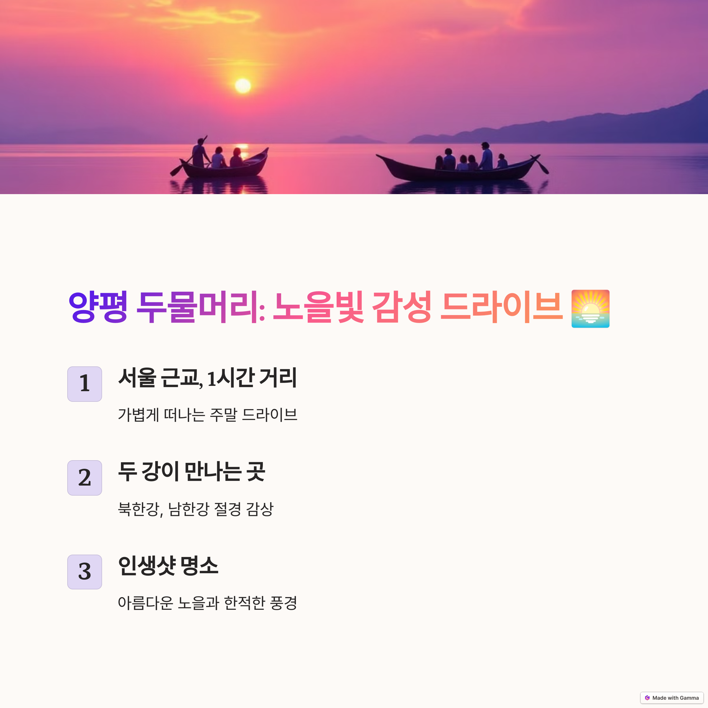 서울 근교 드라이브 코스 중 가장 감성적인 곳 중 하나가 양평 두물머리입니다. 북한강을 따라 이어지는 도로를 달리다 보면 한적한 분위기와 멋진 자연경관을 감상할 수 있습니다. 특히 해 질 무렵에는 강 위로 퍼지는 노을이 환상적이며, 주변에 감성 카페와 작은 공원도 많아 드라이브와 함께 여유로운 시간을 보낼 수 있습니다.