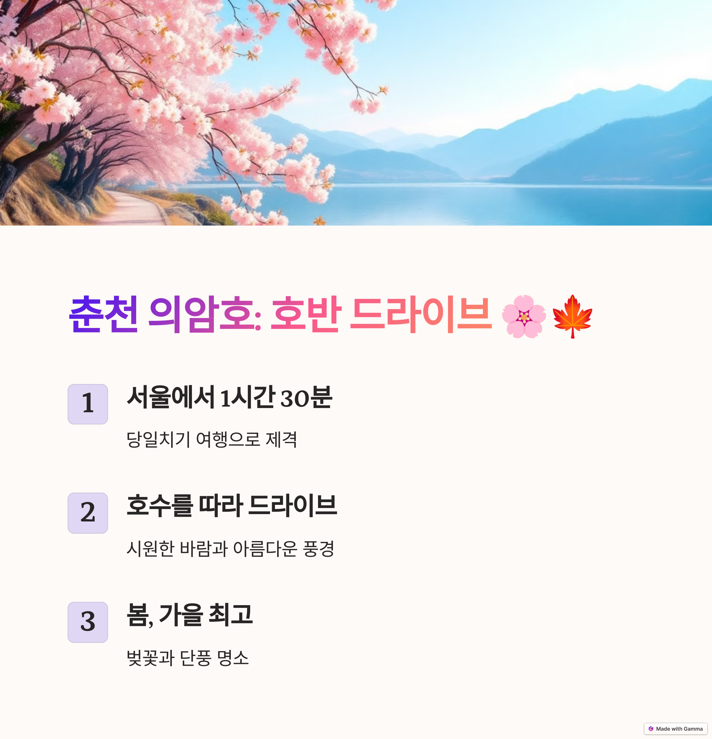 춘천은 서울에서 1시간 30분 정도면 도착할 수 있는 근교 여행지입니다. 그중에서도 의암호를 따라 달리는 드라이브 코스는 가을 단풍과 겨울 설경이 아름답기로 유명합니다. 드라이브 후에는 스카이워크에서 멋진 호수 전망을 감상하거나, 춘천 닭갈비 맛집에서 식사를 즐기는 것도 추천합니다.