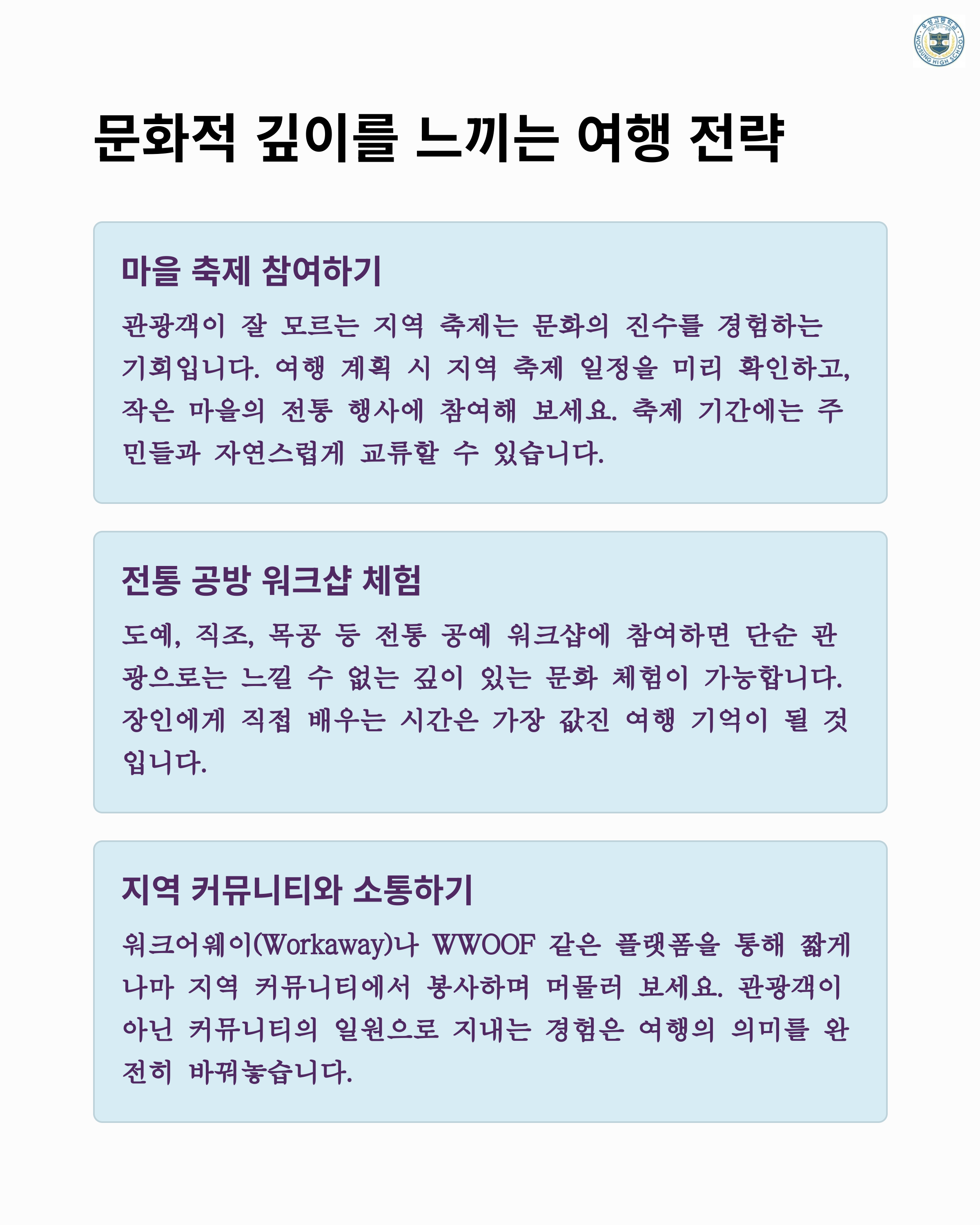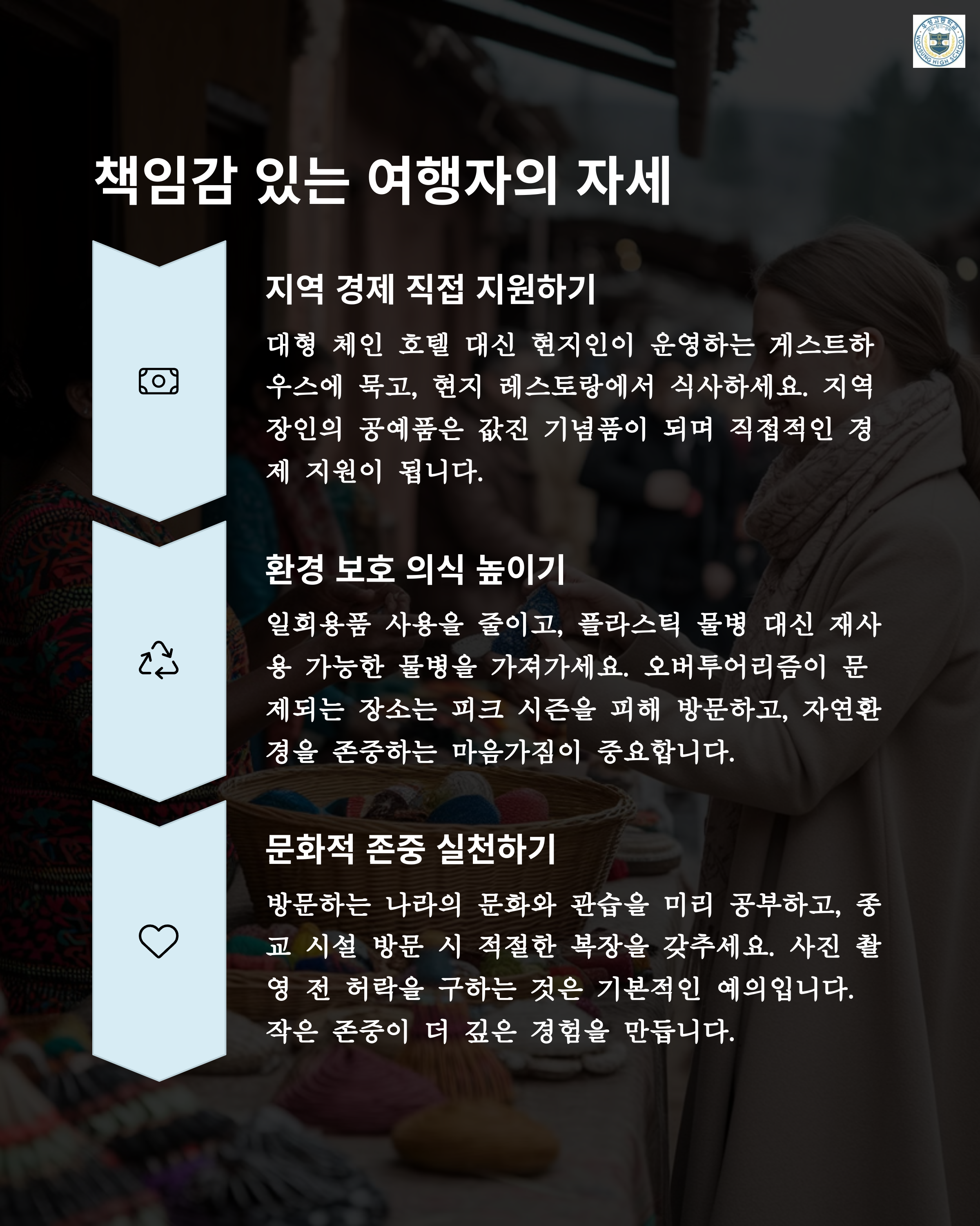 - 지역 문화를 존중하기: 입장 시 인사, 사진 촬영 시 허락 받기 등 소소한 예의가 신뢰를 만듭니다.