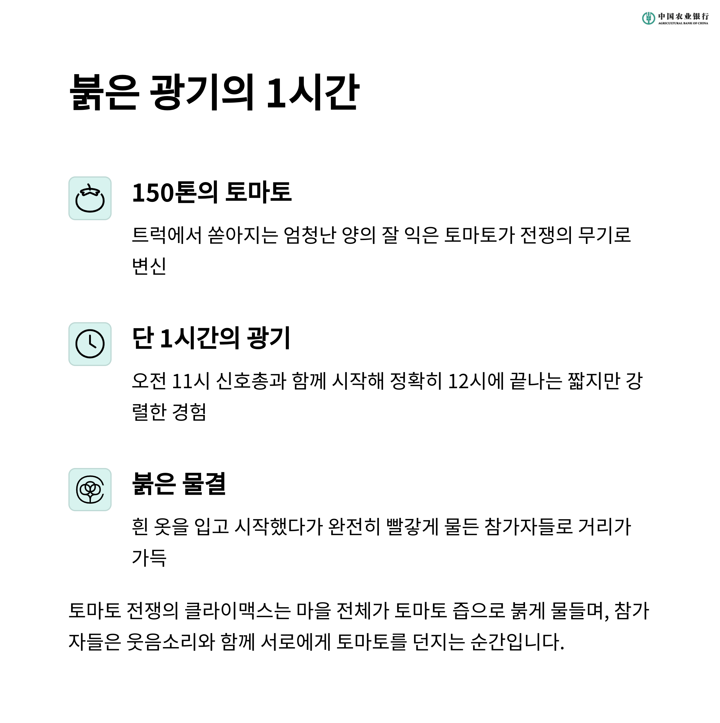 토마토가 튀기면서 서로 상반신을 붉게 물들인 사람들, 그리고 서로를 도우며 같이 나누는 웃음은 그 자체로 희생 없는 즐거움을 보여줍니다.