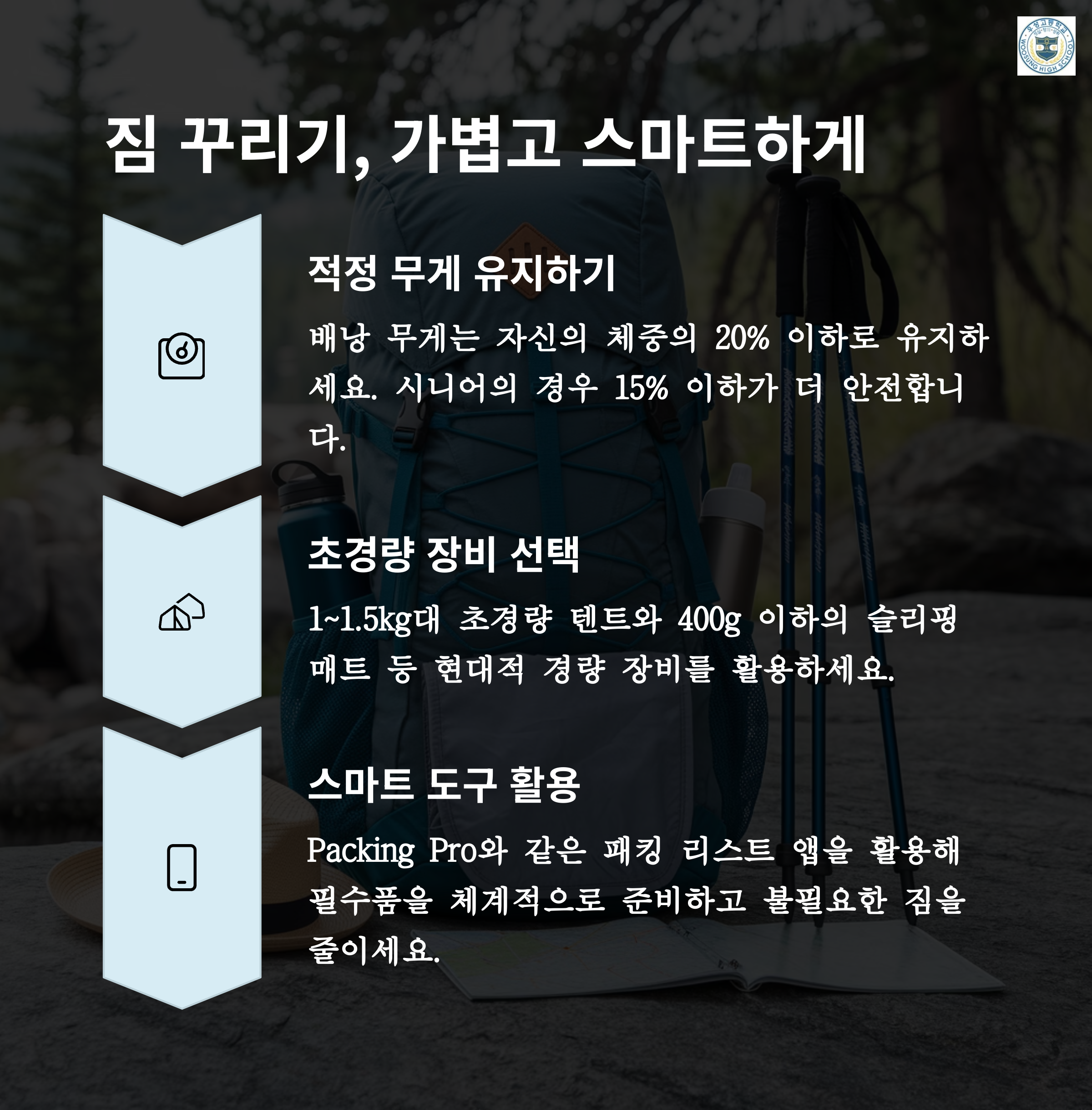 백패킹 전 준비물을 철저히 점검하고, 건강 상태를 체크한 후 여행을 떠나세요.