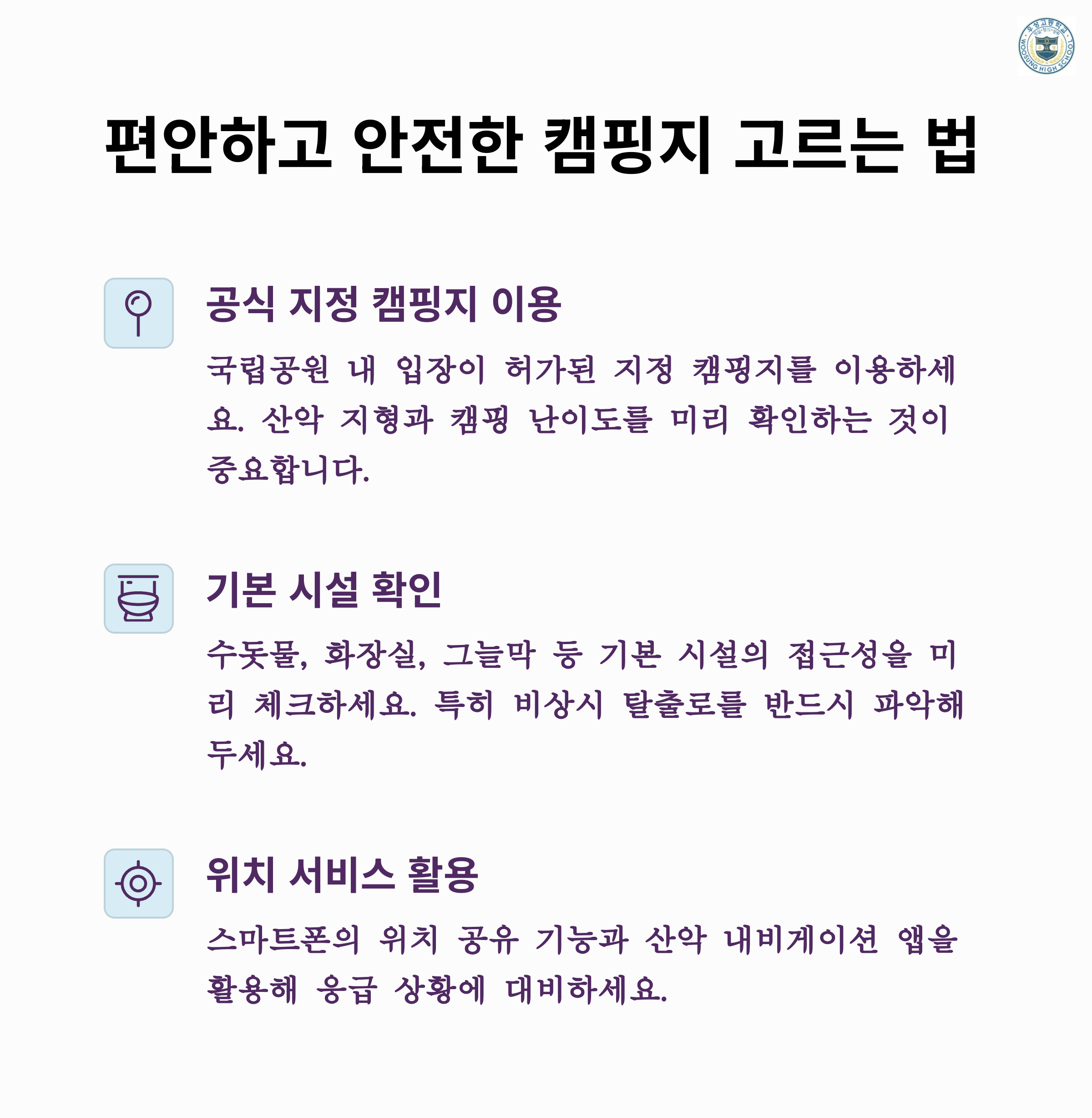 - 추천 활동: 편안한 캠핑지 예약, 시니어 친화적인 캠핑장 찾기