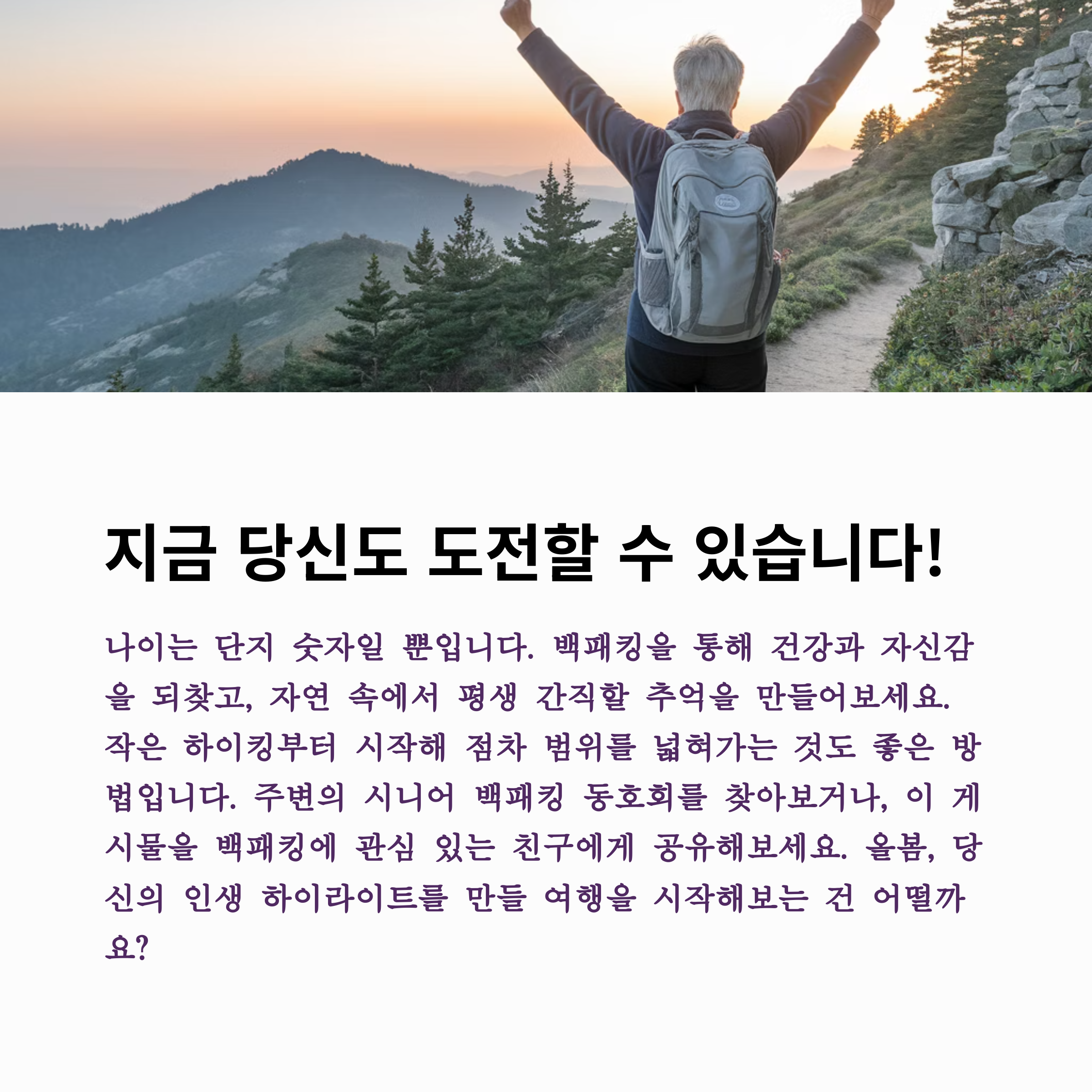 오늘은 시니어 백패킹을 위한 준비물과 건강 관리 팁을 소개하면서, 누구나 모험과 도전을 통해 새로운 경험을 쌓을 수 있는 방법을 안내해 드릴게요.