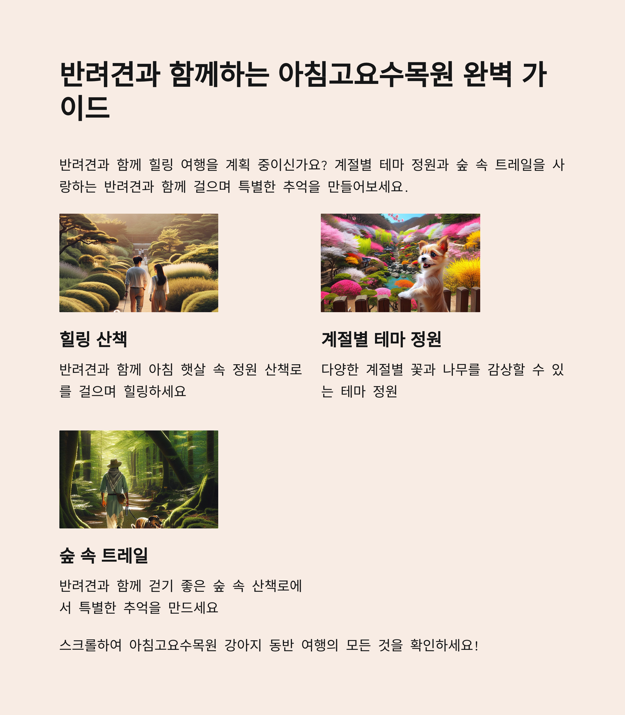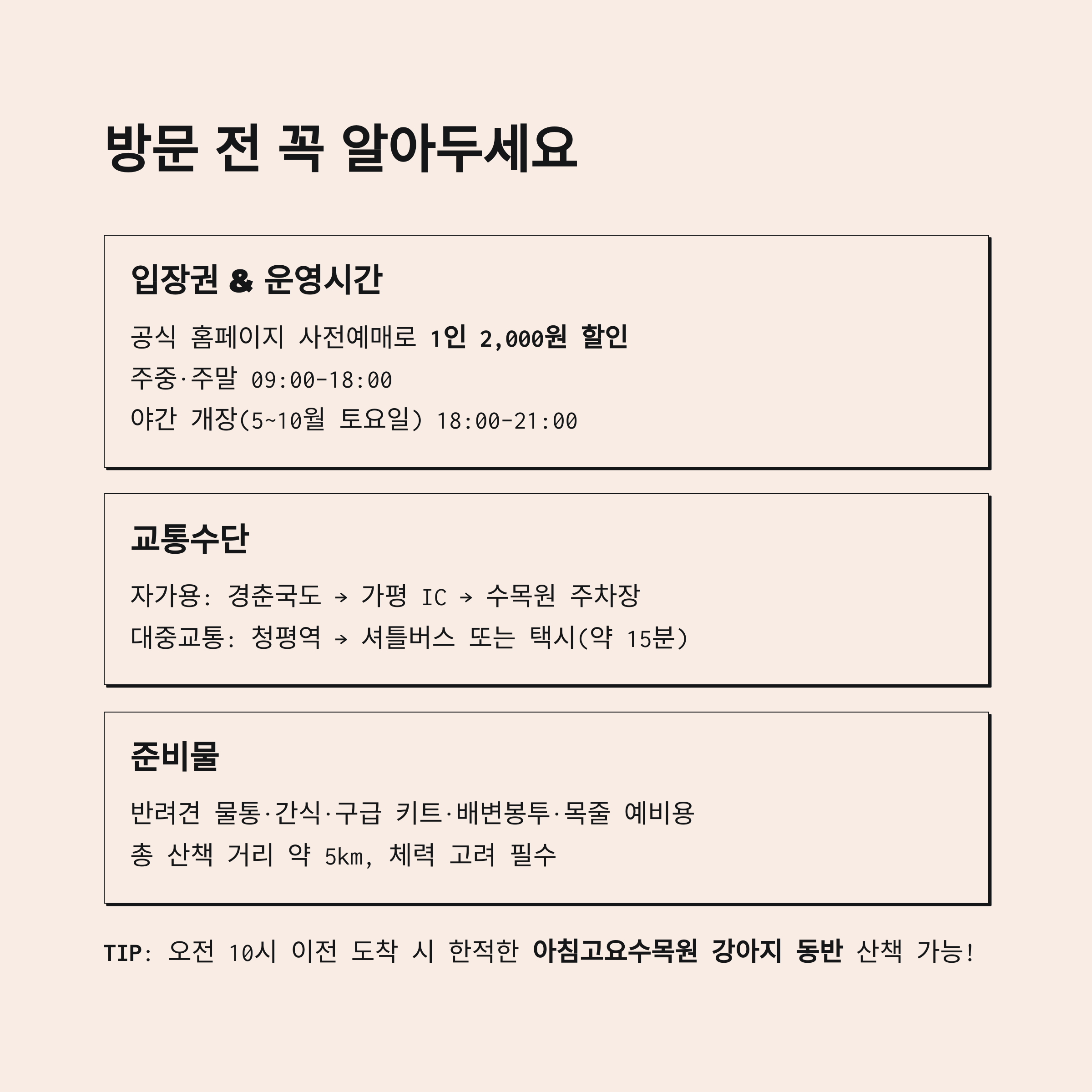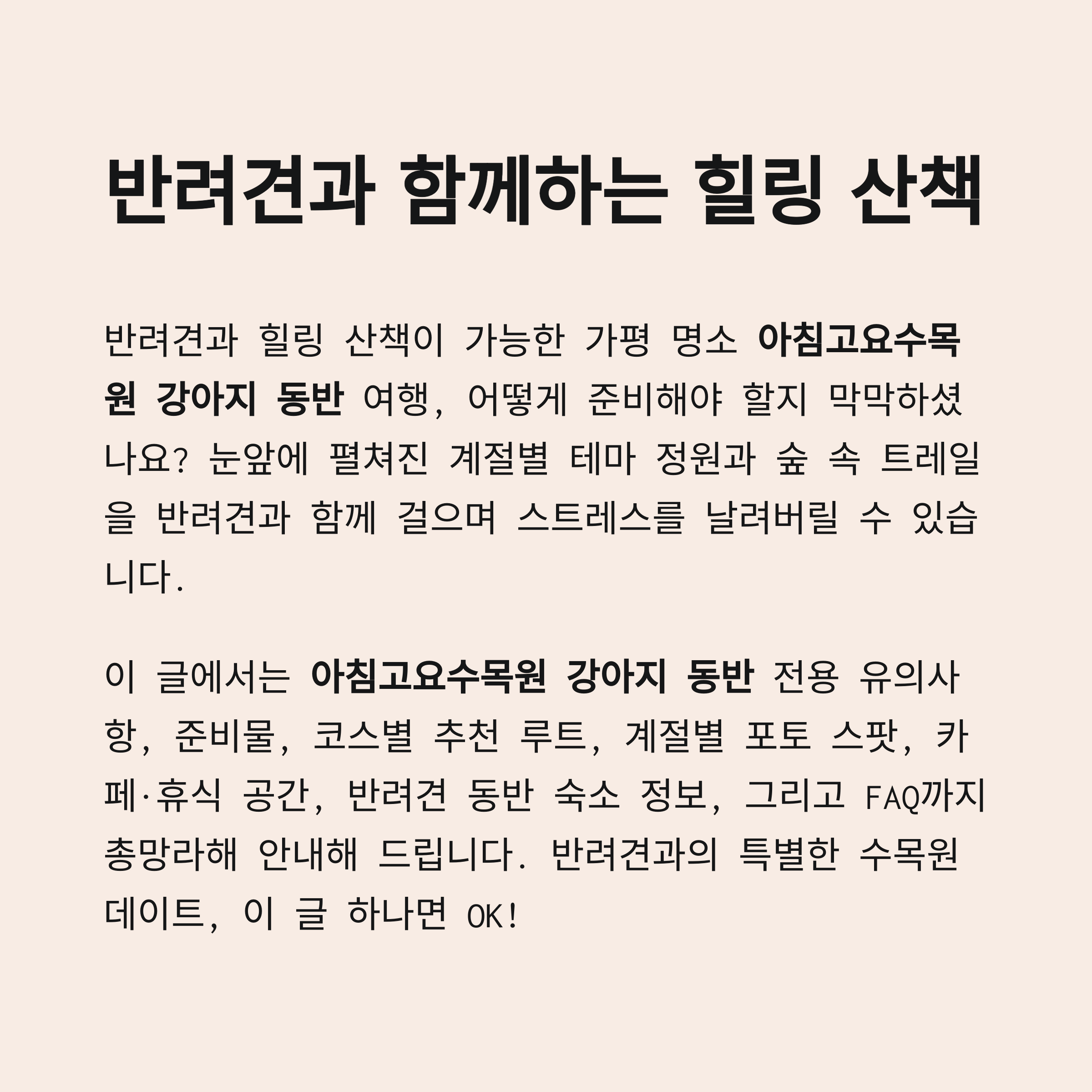 - 포토 팁: Golden Hour(해 뜨기 직후·직전)에 아침고요수목원 강아지 동반 샷 남기기!