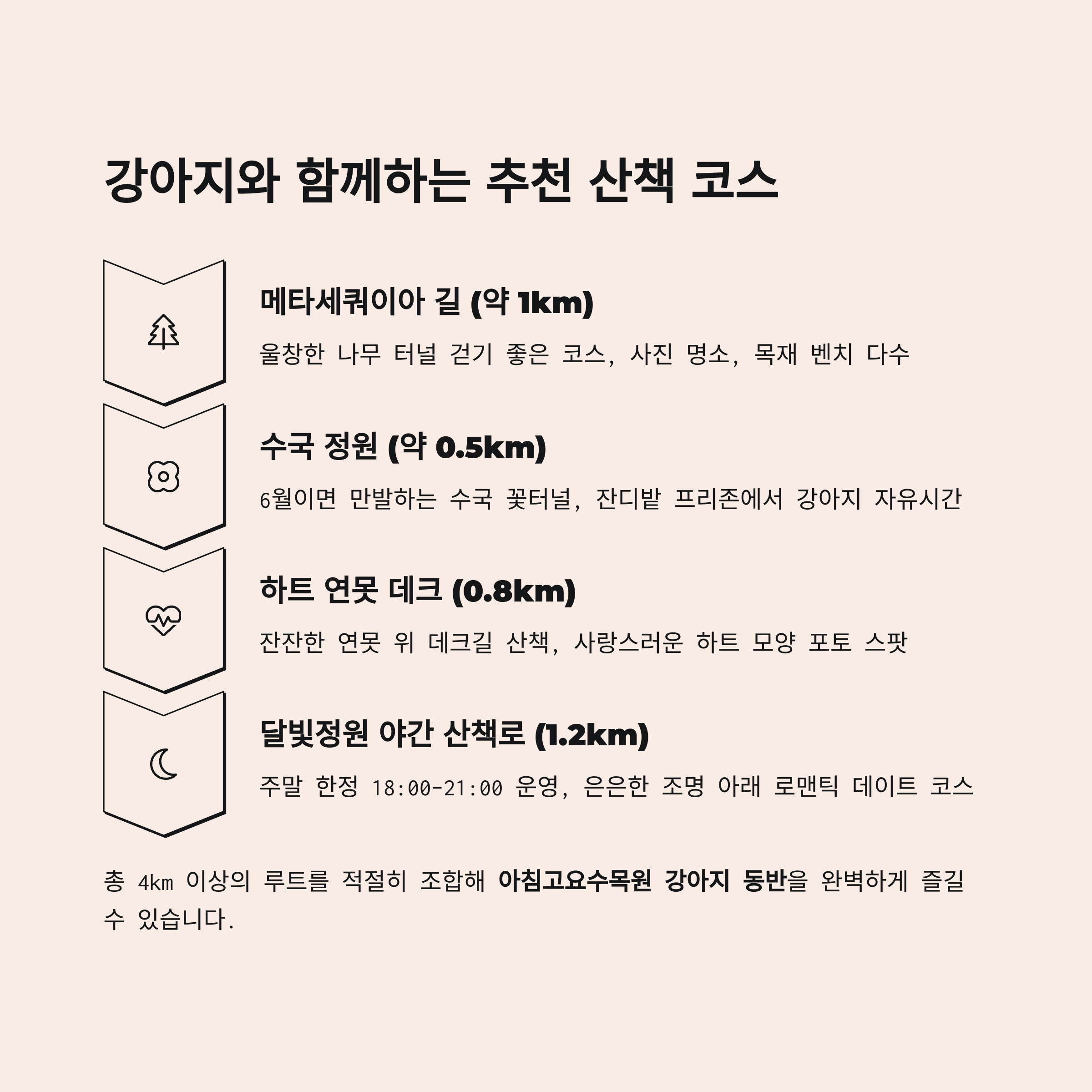 - 체력 고려: 총 산책 거리 약 5km, 쉬어갈 수 있는 벤치 및 쉼터 다수