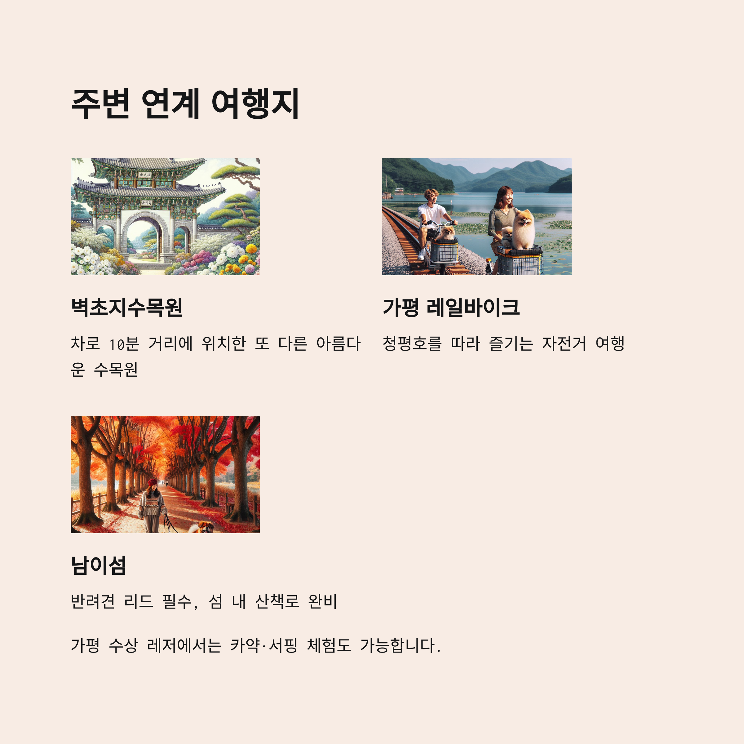 - 남이섬: 반려견 리드 필수, 섬 내 산책로 완비