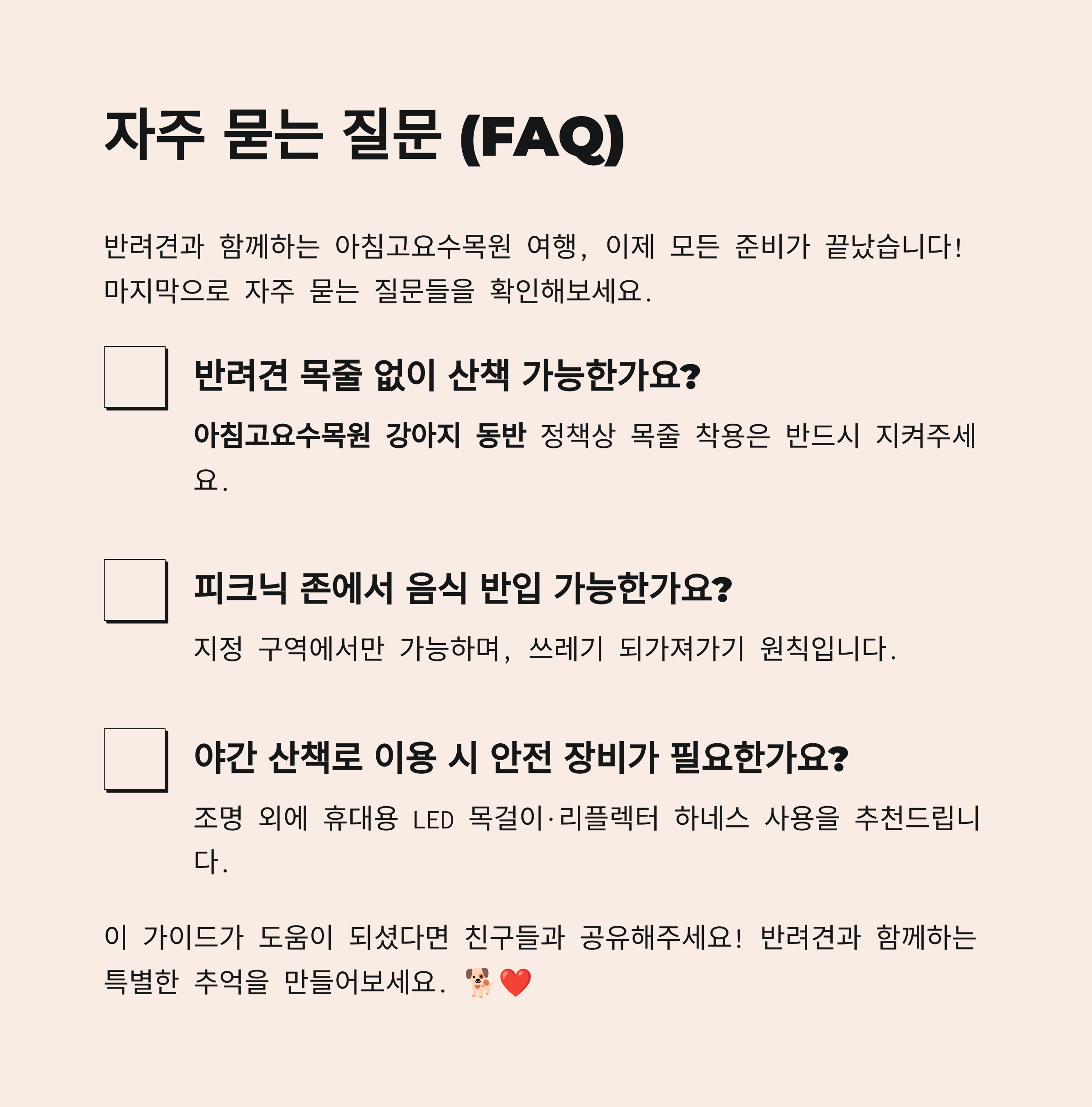 | 반려견 목줄 없이 산책 가능한가요? | 아침고요수목원 강아지 동반 정책상 목줄 착용은 반드시 지켜주세요. |