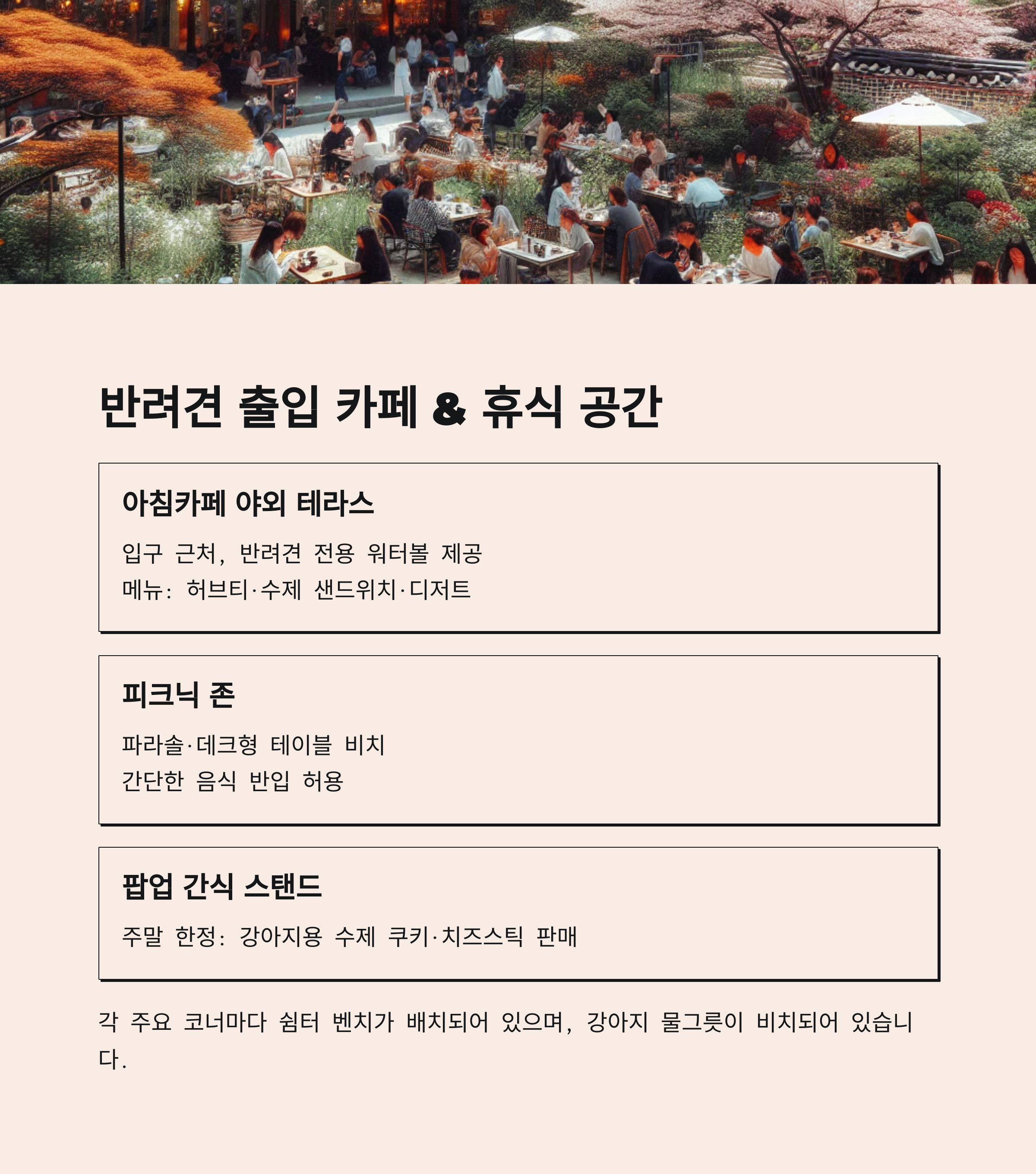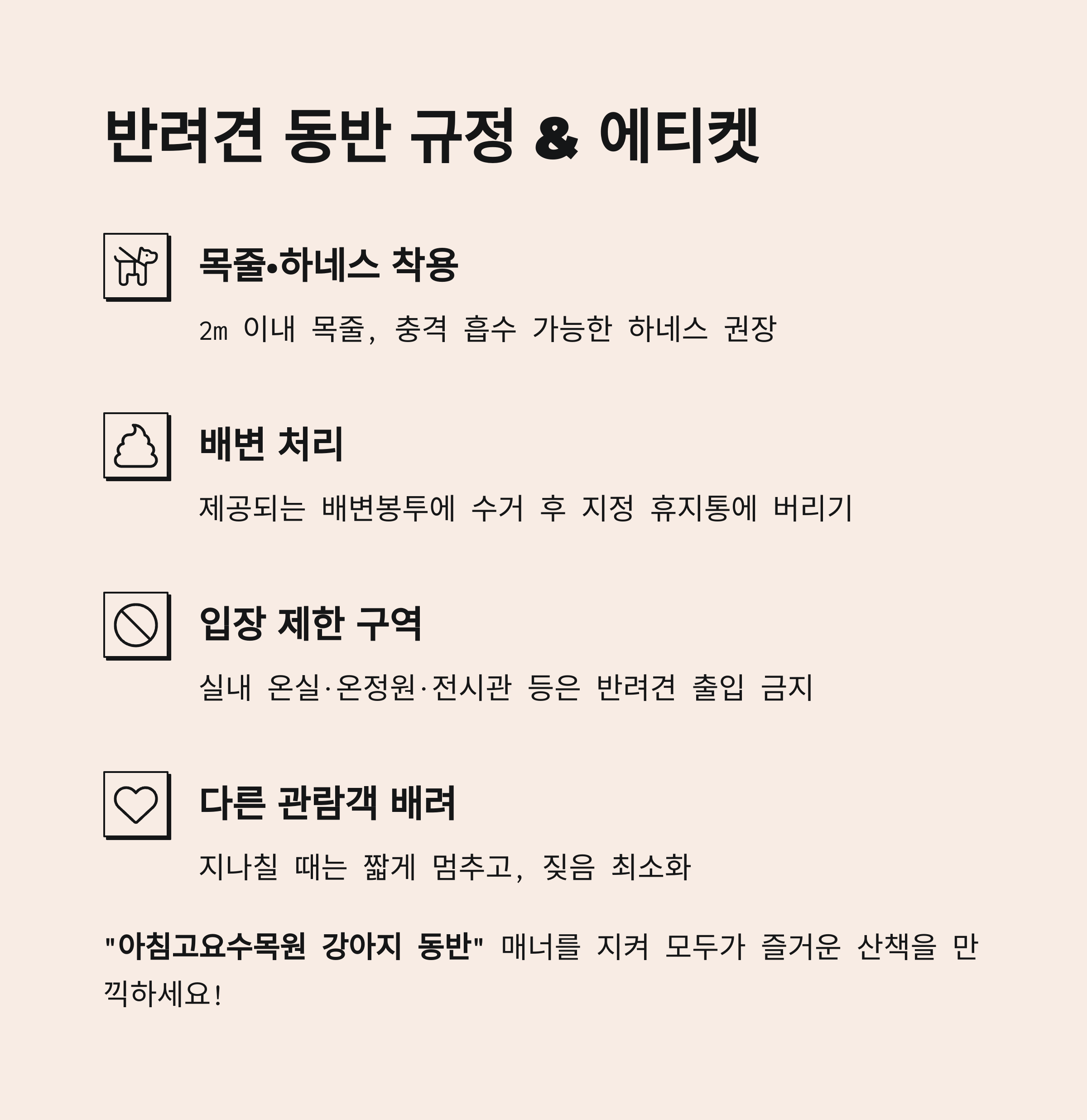 - 입장 제한 구역: 실내 온실·온정원·전시관 등은 반려견 출입 금지