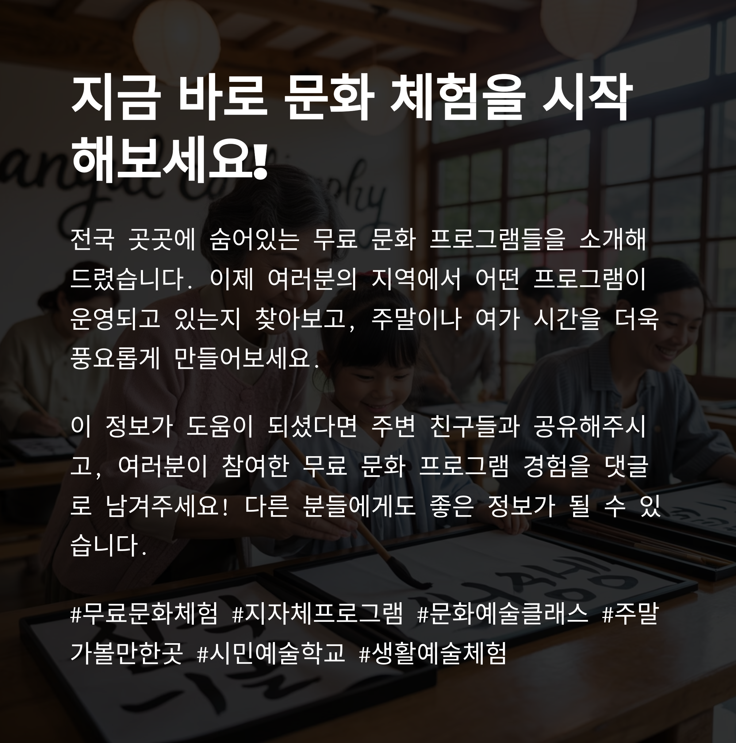 문화 체험의 문턱은 생각보다 낮고, 기회는 매달 열려 있습니다.