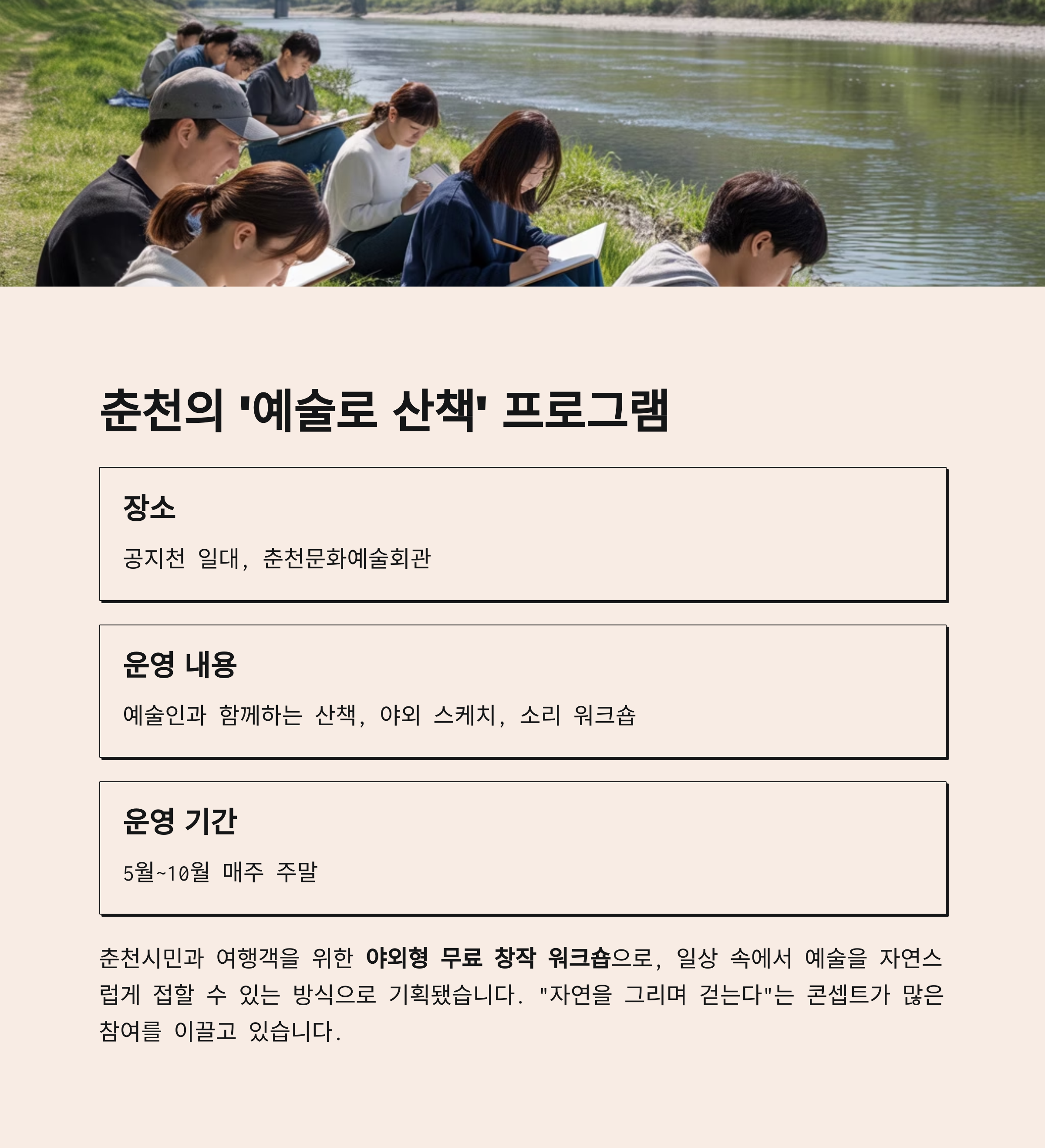 | 운영 내용 | 예술인과 함께하는 산책, 야외 스케치, 소리 워크숍 |