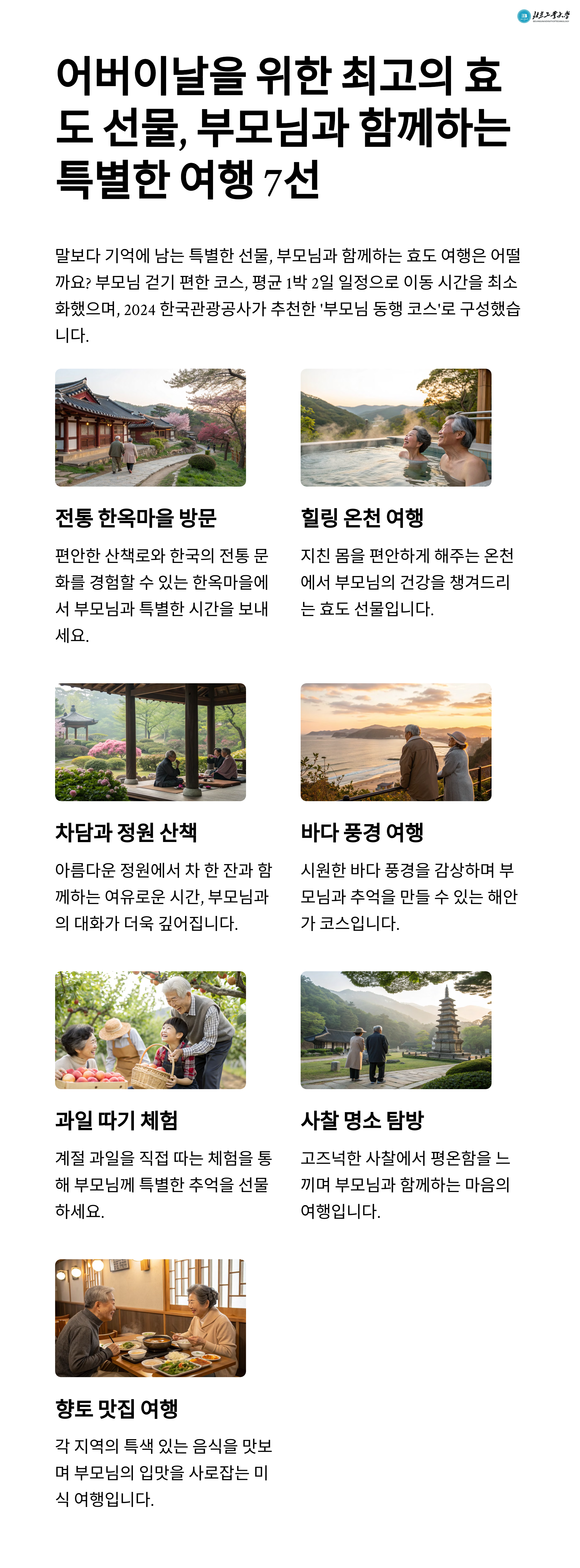 어린 시절 손을 꼭 잡아주시던 그분들께, 이제는 우리가 여행이라는 선물로 감사를 전할 차례입니다. 무리 없는 동선, 고요하고 편안한 분위기, 그리고 부모님 세대가 공감할 수 있는 체험. 이번 어버이날엔 감사와 사랑을 담은 특별한 효도 여행 코스를 함께 떠나보세요.