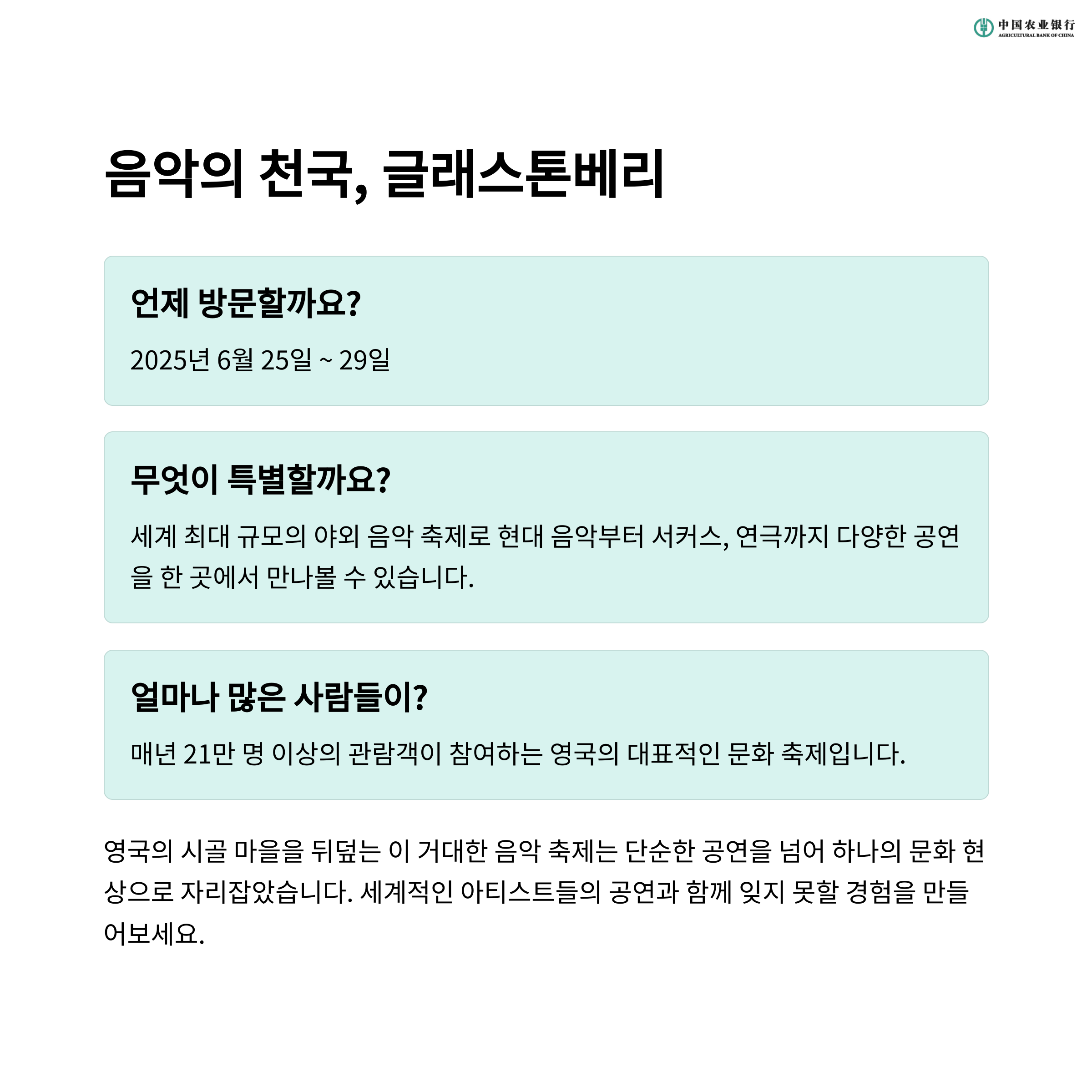 영국에서 가장 유명한 **글래스톤베리 페스티벌(Glastonbury Festival)**은 단순한 음악 축제가 아닙니다.