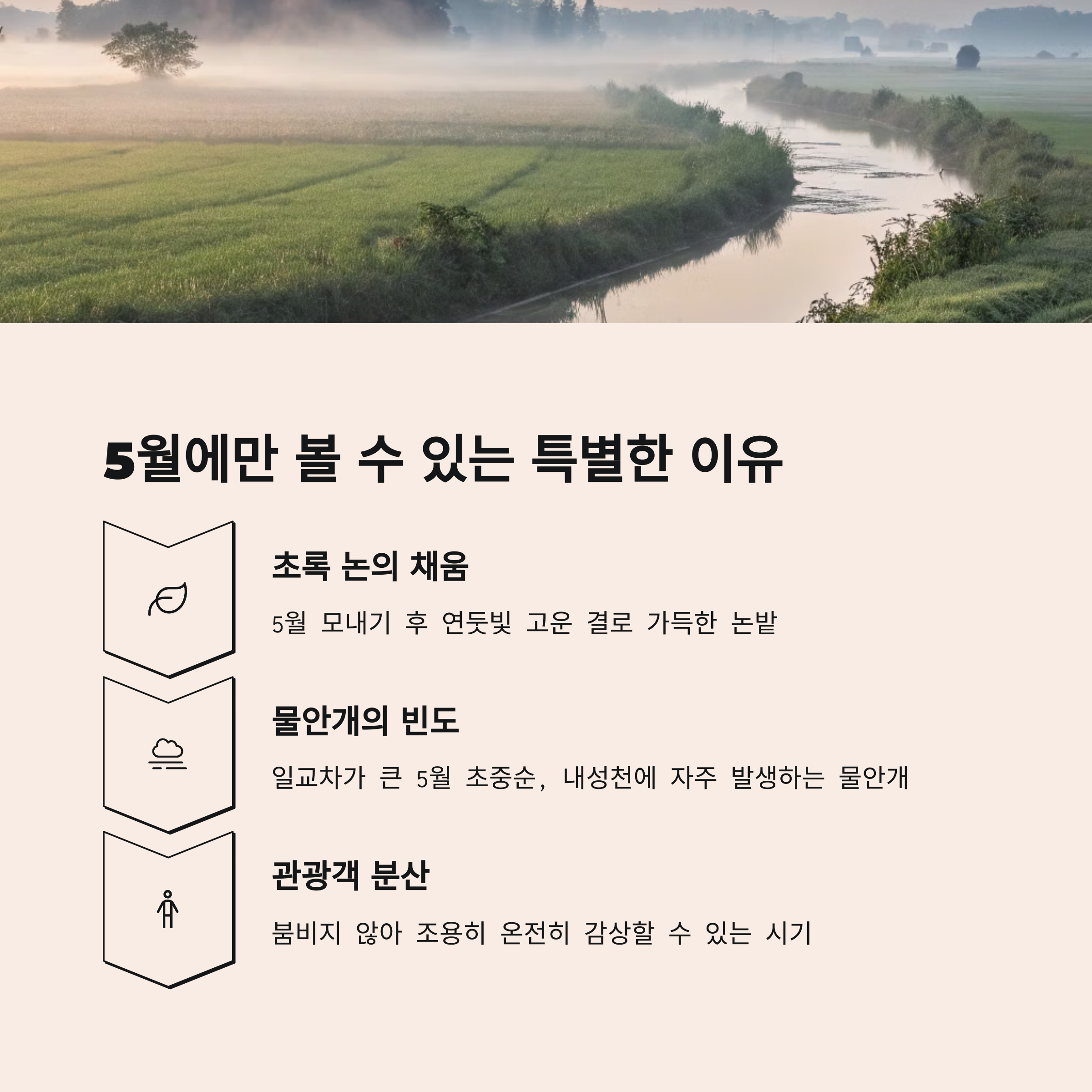 이때의 논은 강과 대비되어 선명한 색감을 만들어냅니다 - 물안개의 빈도