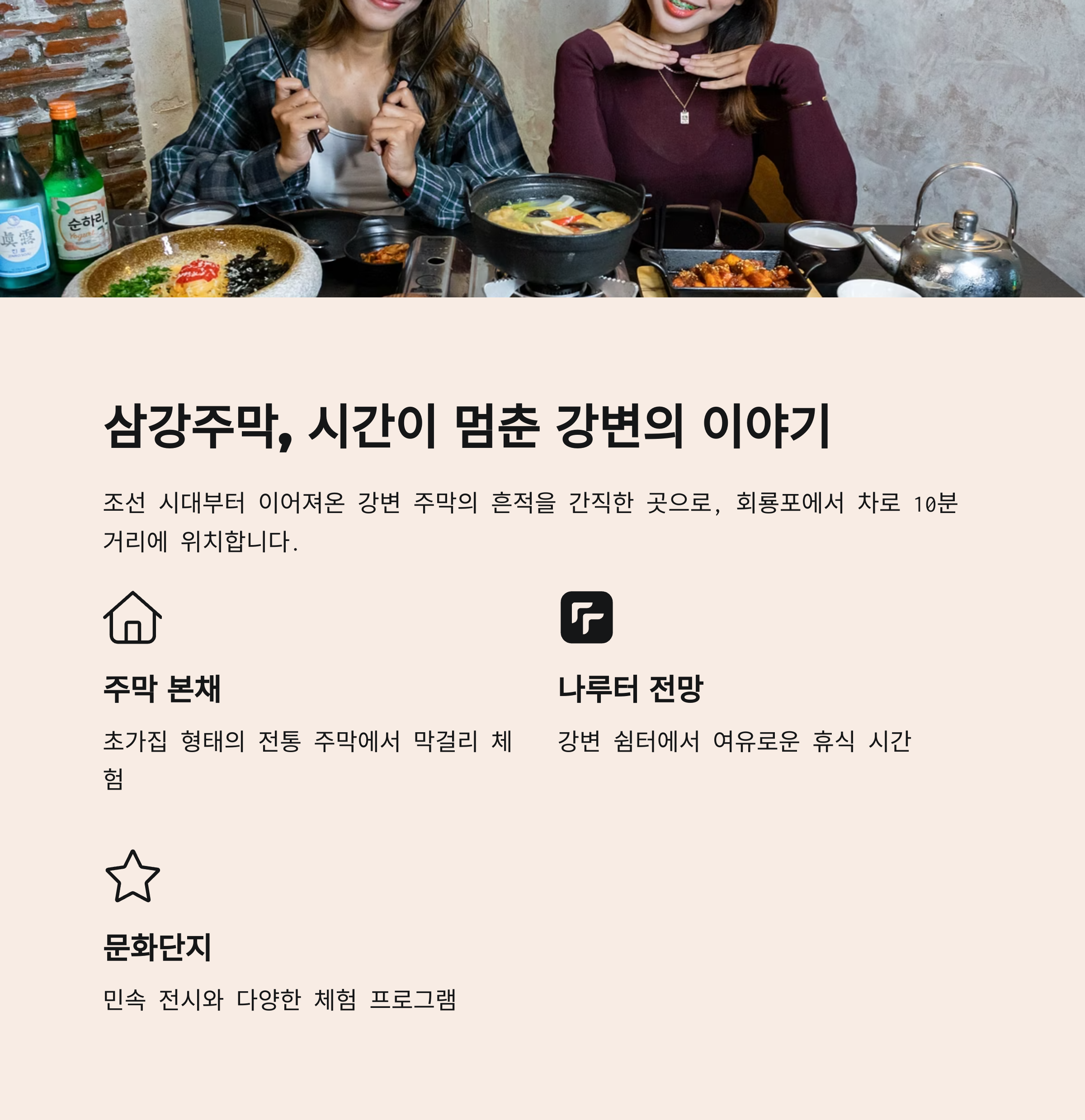 삼강문화단지 | 민속 전시, 체험 프로그램 운영 | 가족 단위 방문객에게도 적합 |