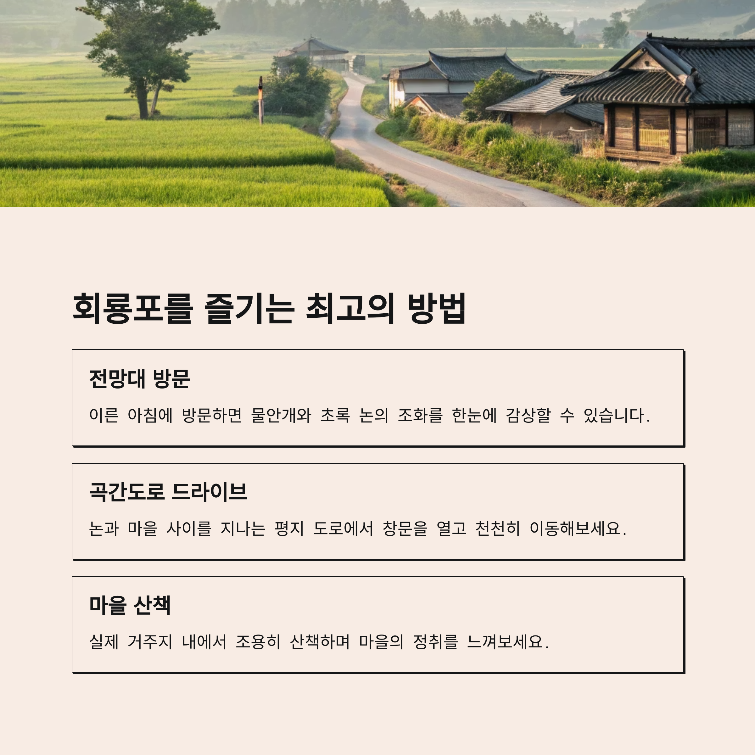 | 회룡포 마을 산책 | 실제 거주지 내 산책 가능 | 조용히, 마을 예절 유의 |