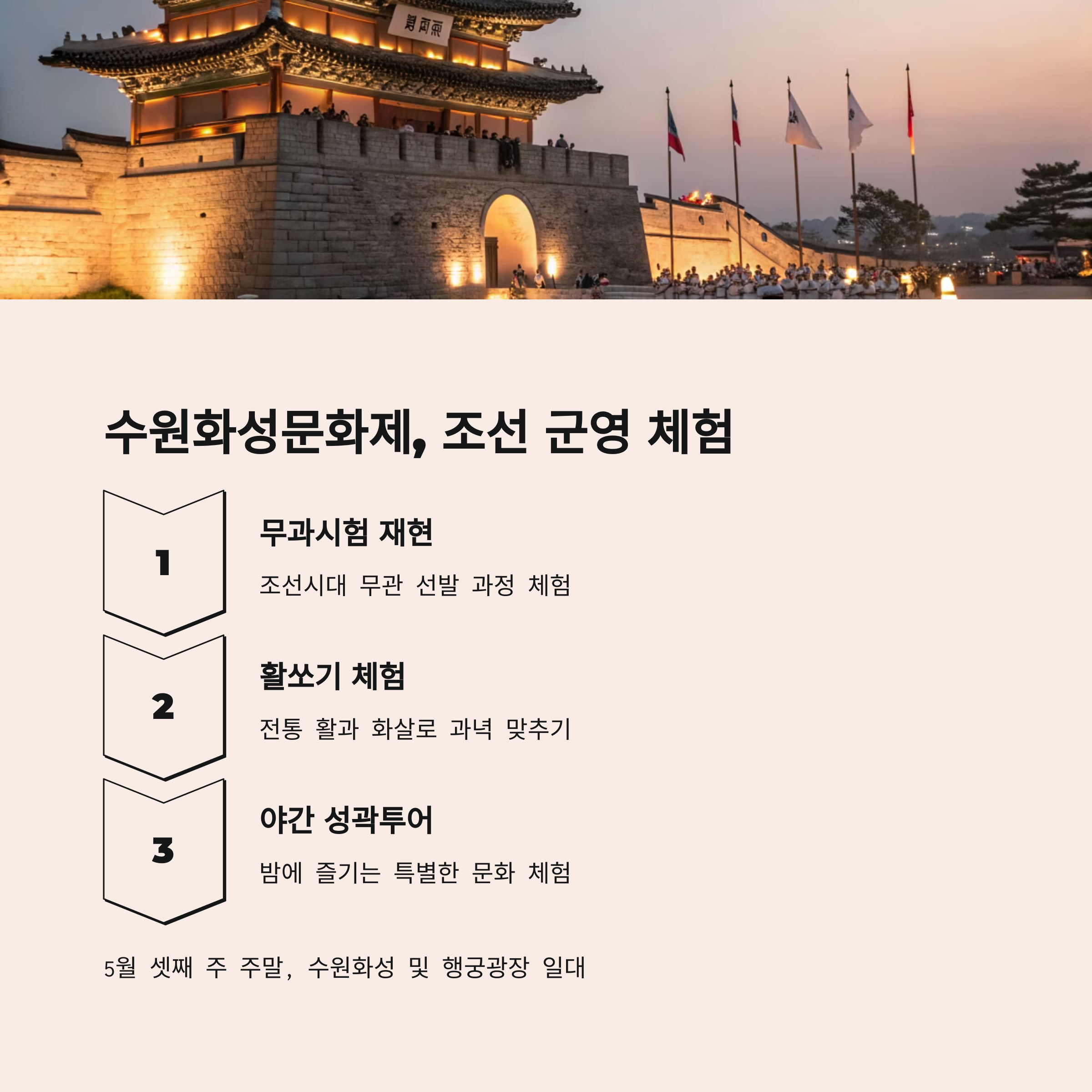 수원화성행궁 주변에서 펼쳐지는 무과시험 재현, 활쏘기 체험, 전통 군복 입어보기 등은