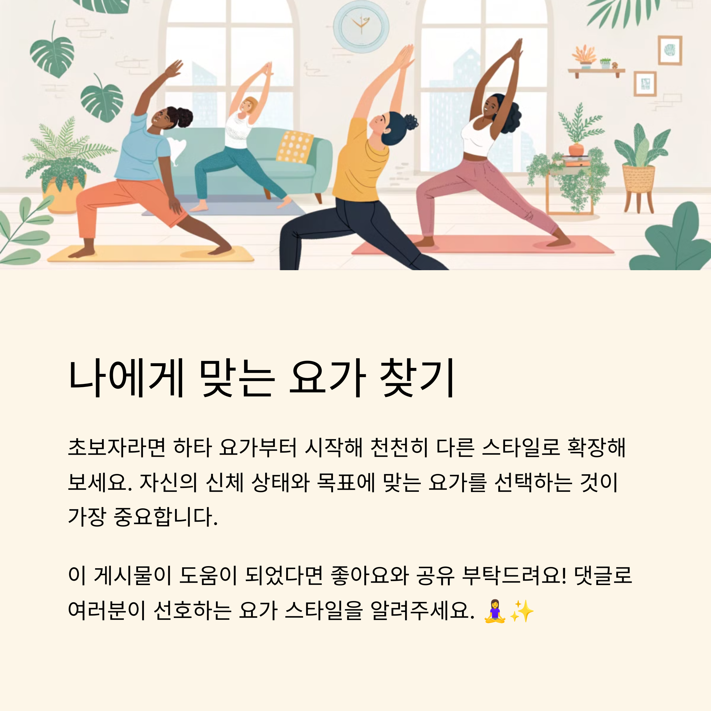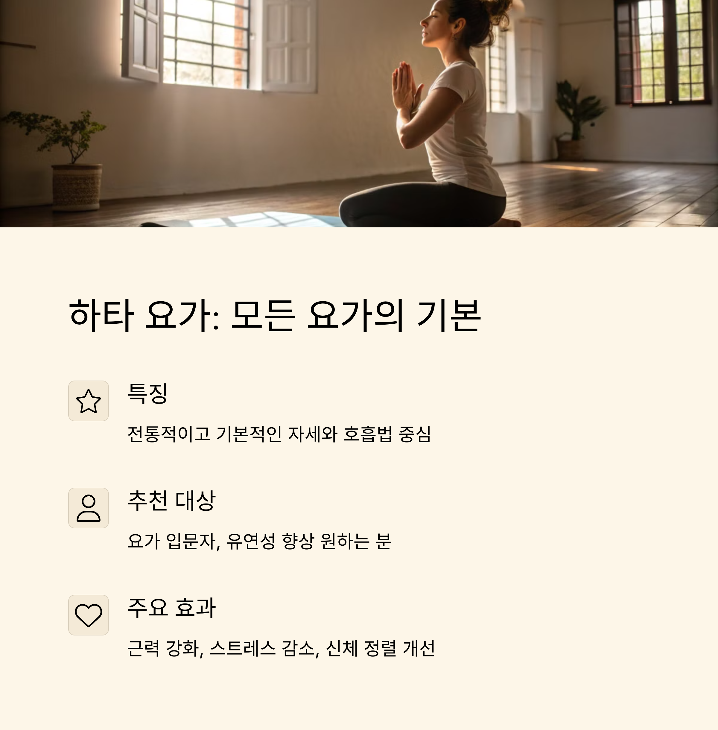 | 하타 요가 | 느림, 정적 중심 | 요가 입문자, 스트레스 많은 사람 |