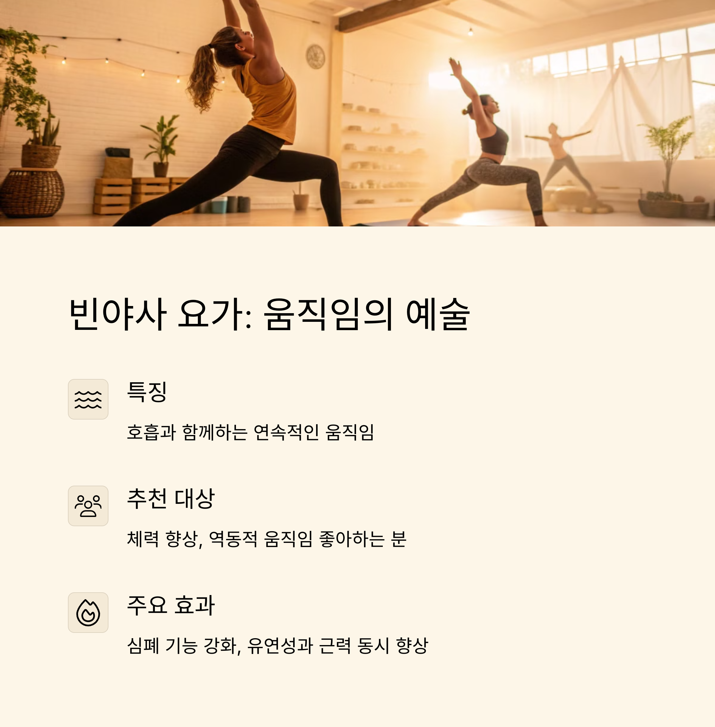 | 빈야사 요가 | 흐름, 유연한 연결 동작 | 활동적인 타입, 집중 어려운 사람 |