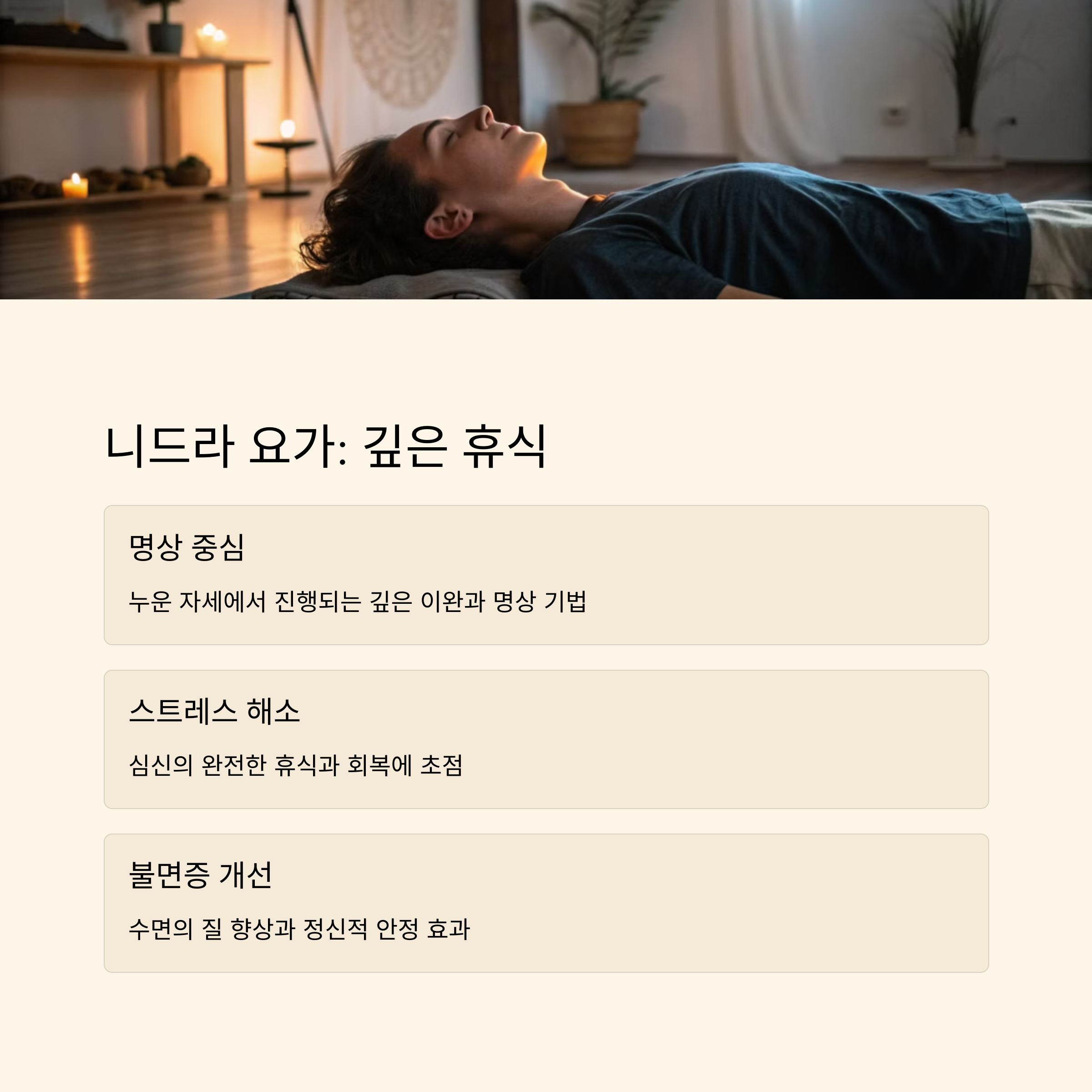 | 니드라 요가 | 수면유도, 의식명상 | 불면, 번아웃, 과몰입형 성향 |