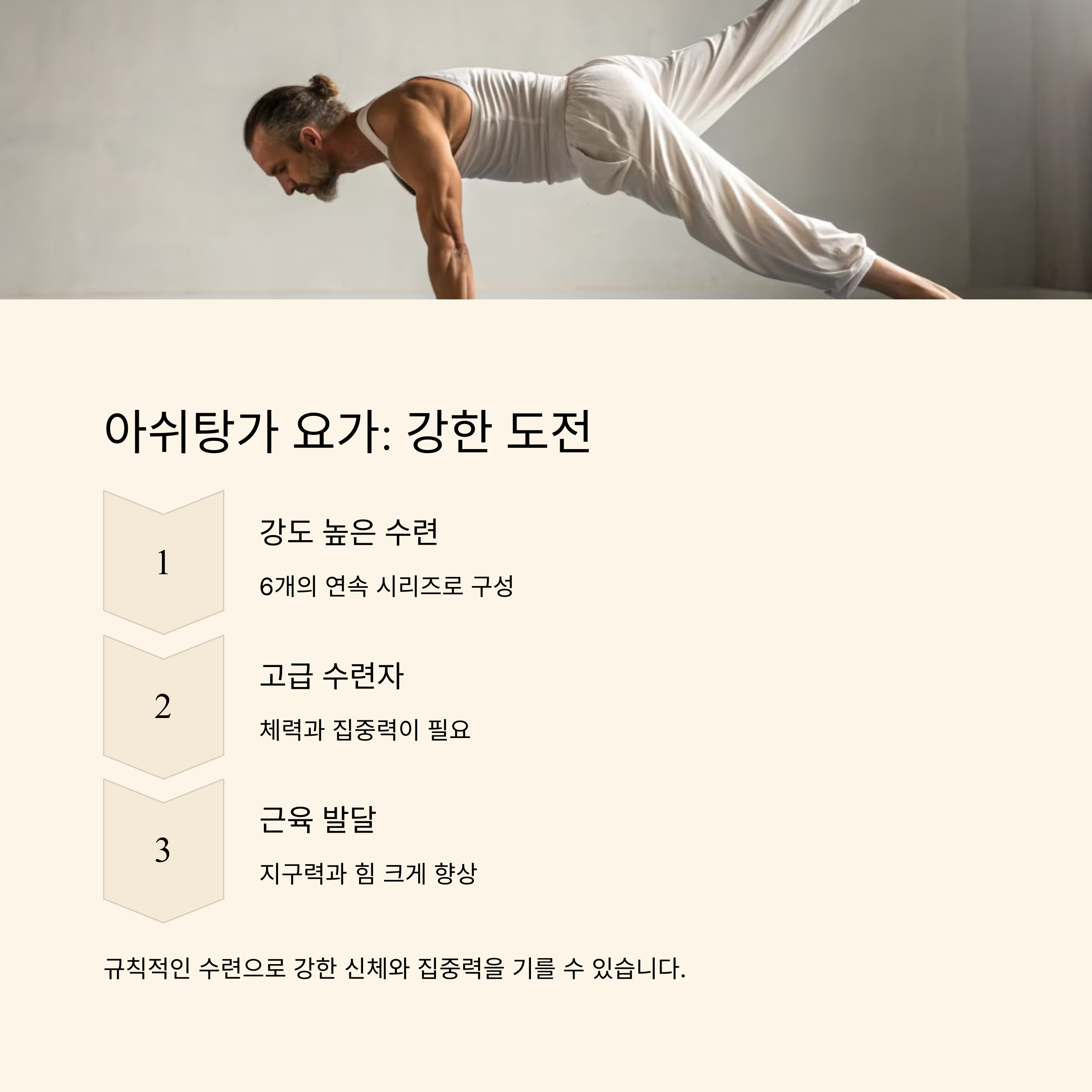 | 아쉬탕가 요가 | 고강도, 정해진 시퀀스 | 근력·체력 키우고 싶은 분 |
