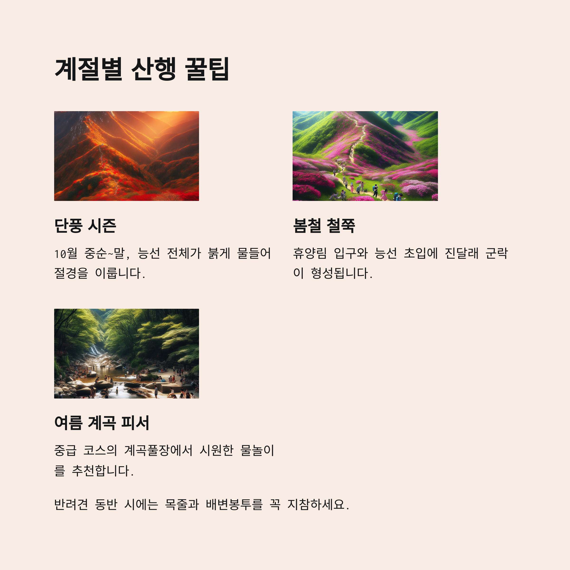 - 단풍 시즌: 10월 중순~말, 능선 전체 붉게 물들어 절경