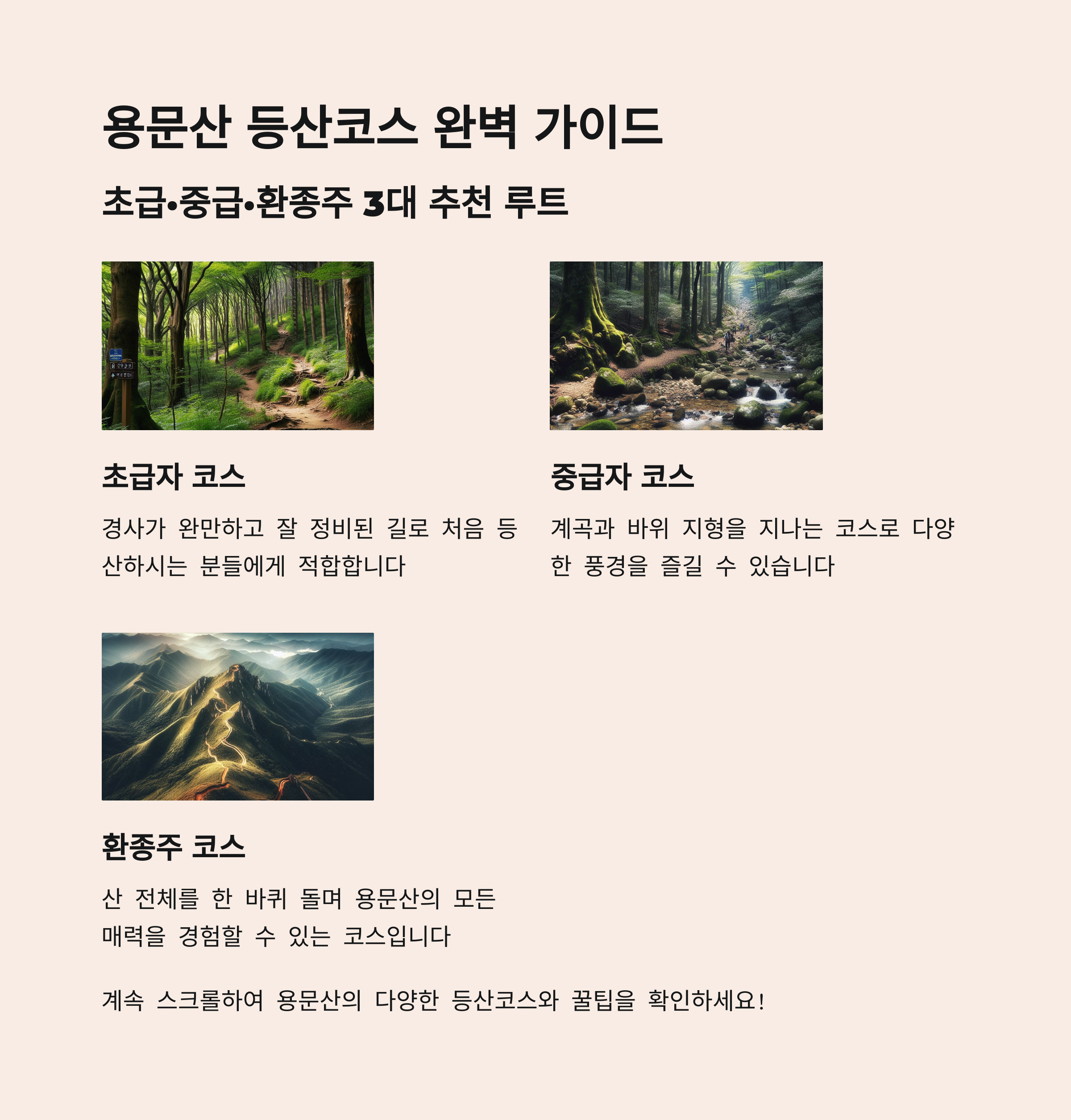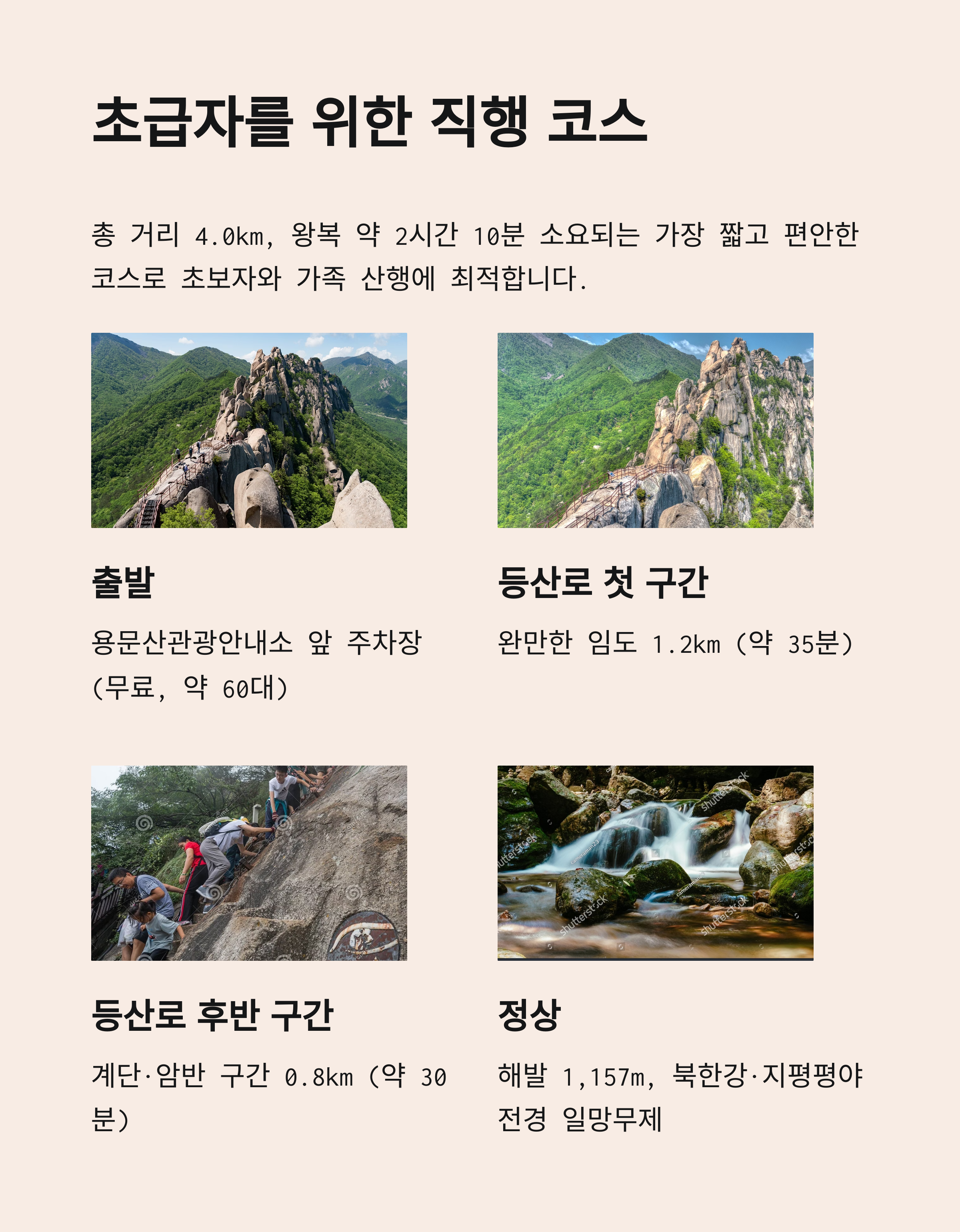 - 특징: 가장 짧고 편안한 코스로 초보자·가족 산행에 최적