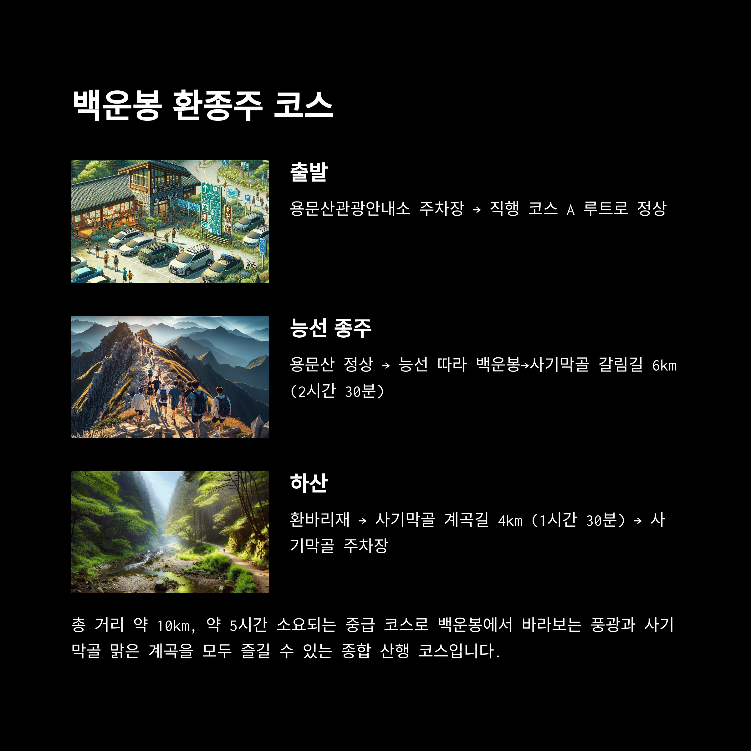 - 특징: 백운봉·능선 조망·계곡 하산까지 종합 산행 코스