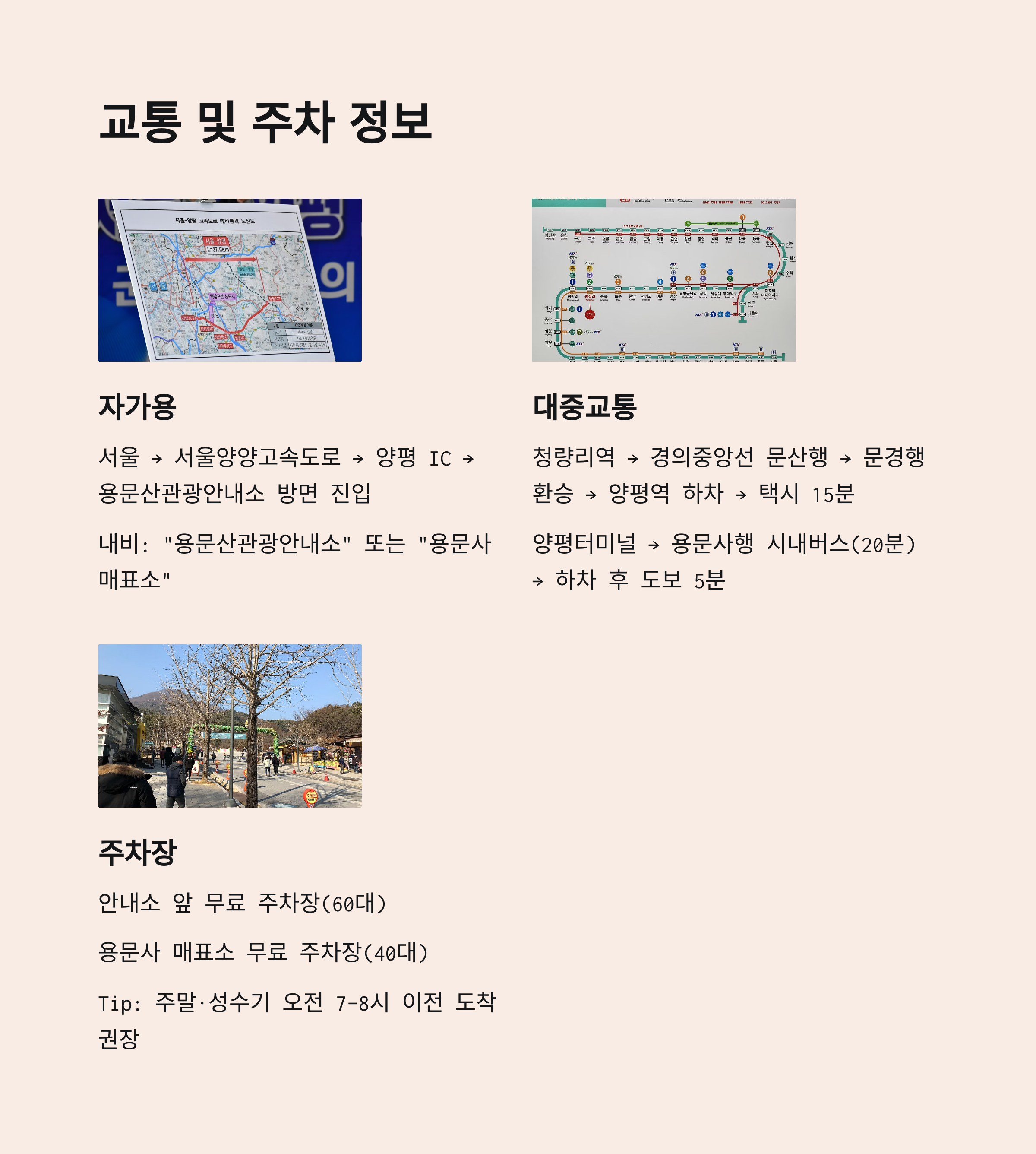 • 용문사 매표소 무료 주차장(40대) - Tip: 주말·성수기 오전 7–8시 이전 도착 권장*