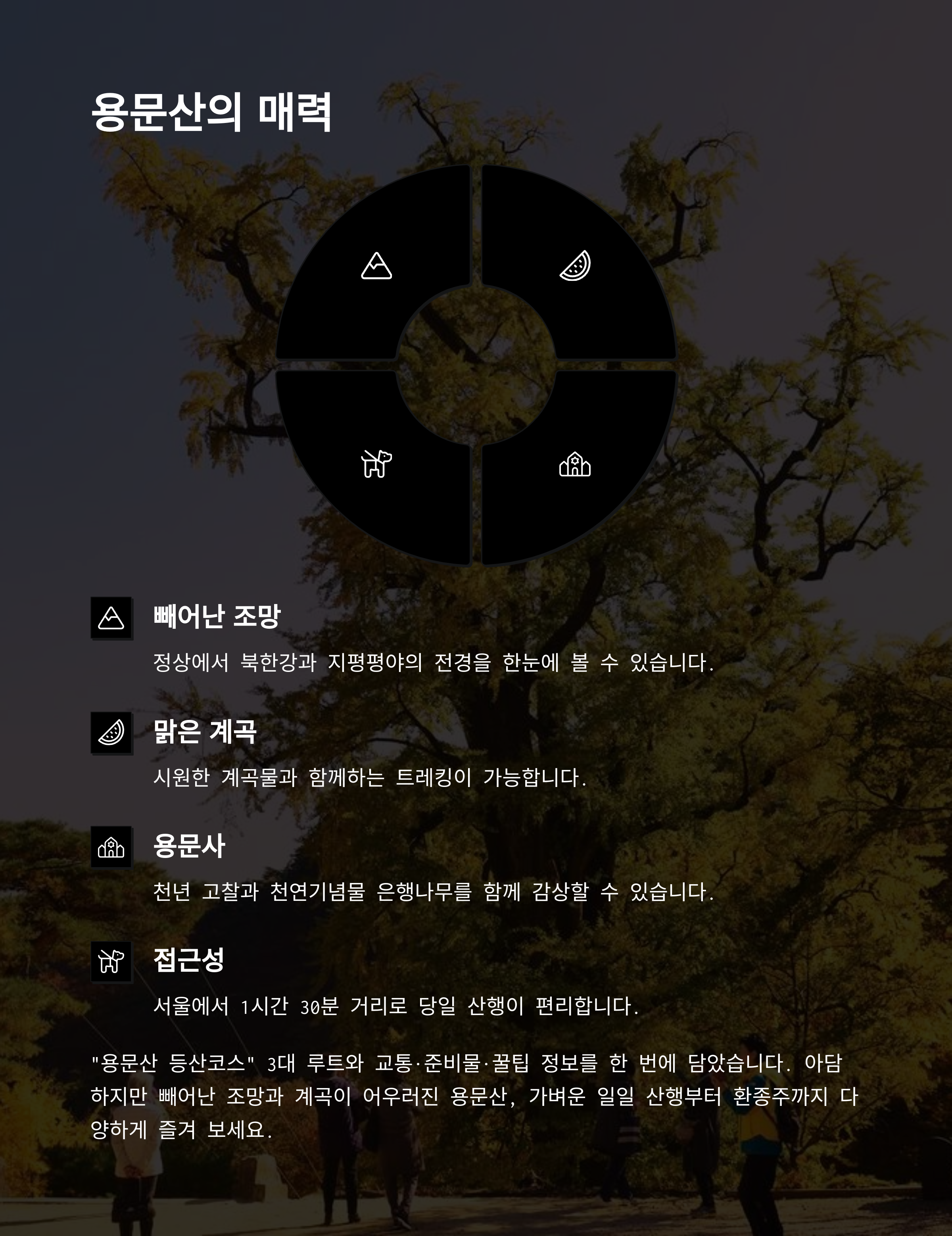 가벼운 일일 산행부터 환종주까지 다양하게 즐겨 보세요. 안전하고 즐거운 산행 되시길 바랍니다!