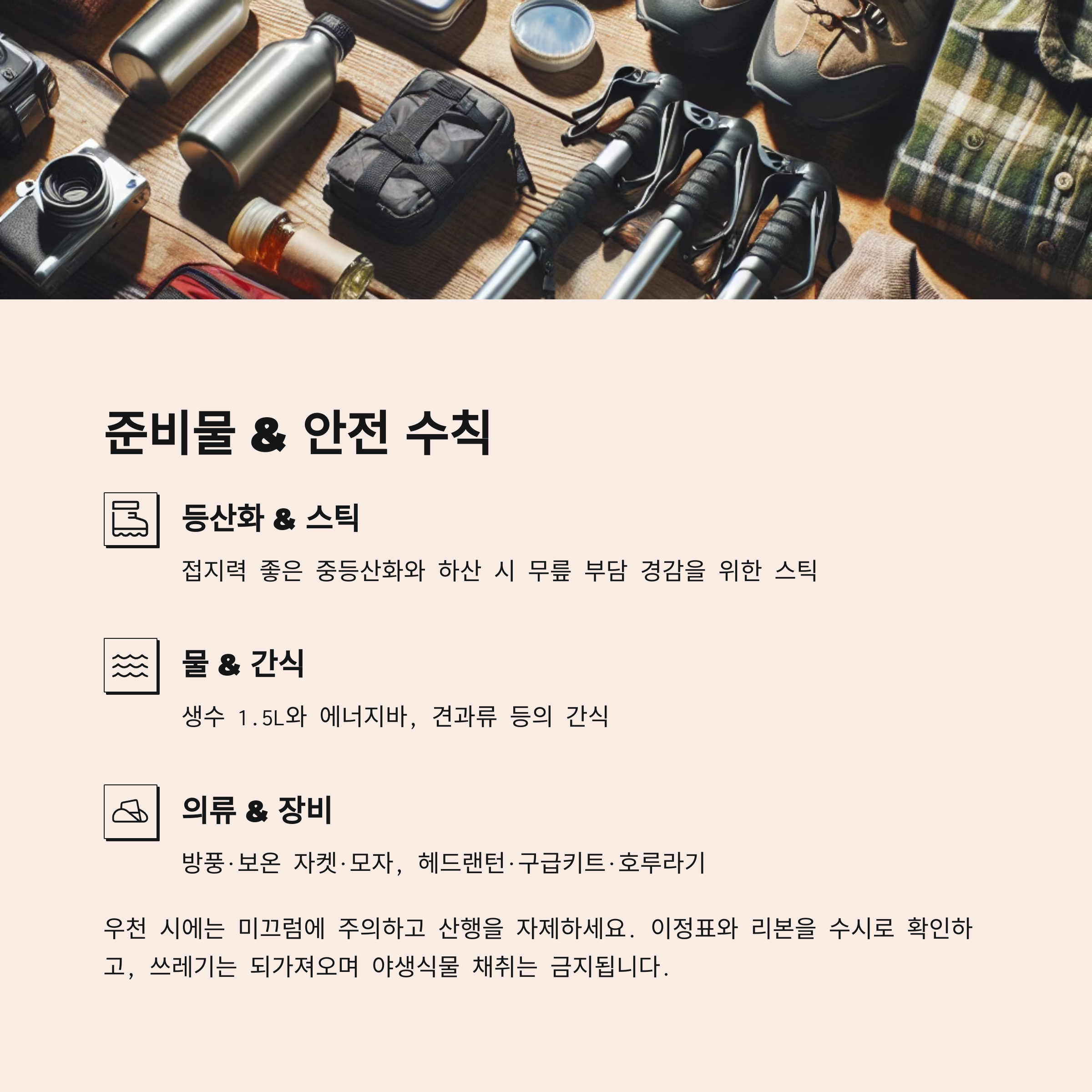 - 물·간식: 생수 1.5L·에너지바·견과류