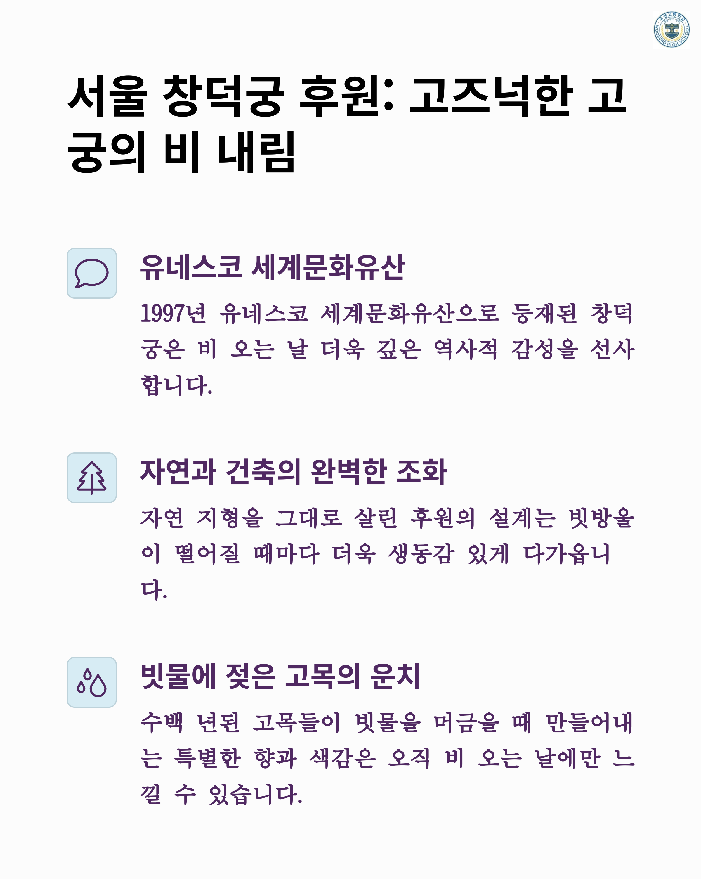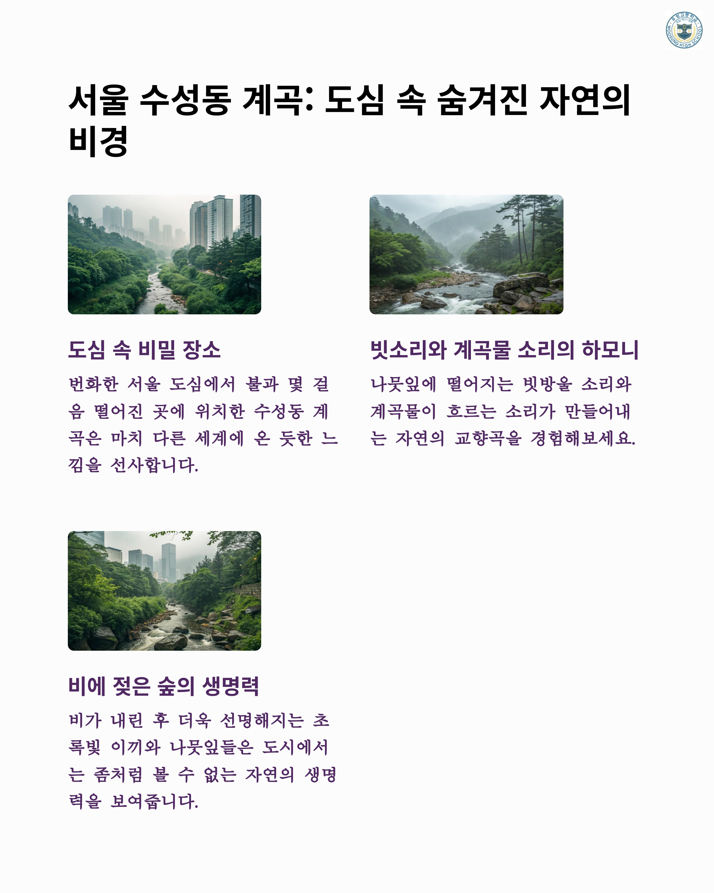 비에 젖은 고궁의 정취와 도심 속 자연 계곡의 조화는 마음을 평온하게 합니다. 특히 창덕궁 후원의 고목들이 빗물에 반짝이는 모습은 한 폭의 수채화를 연상시킵니다.