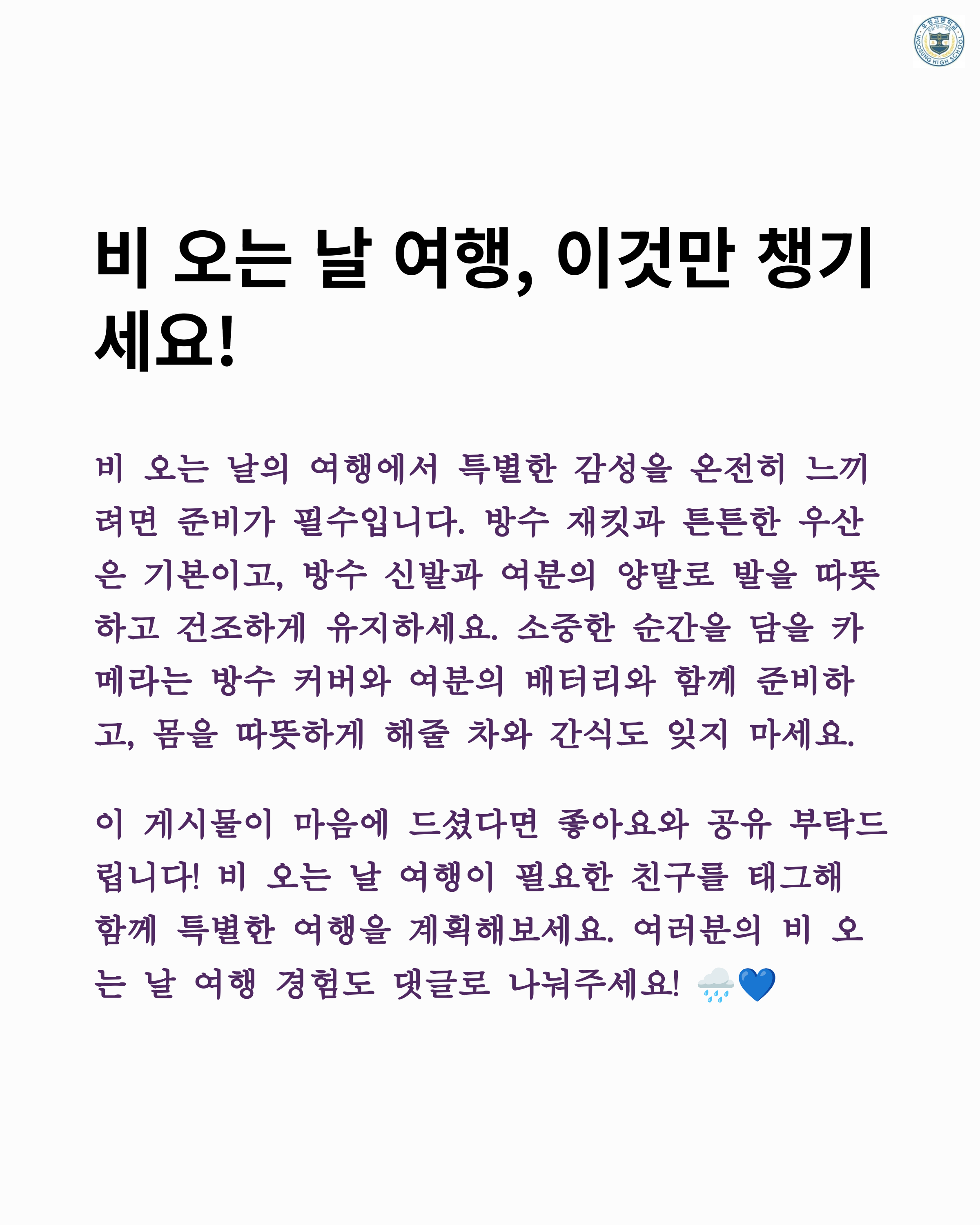 - 여벌의 옷 준비: 비에 젖었을 때를 대비해 여분의 옷을 챙기세요.