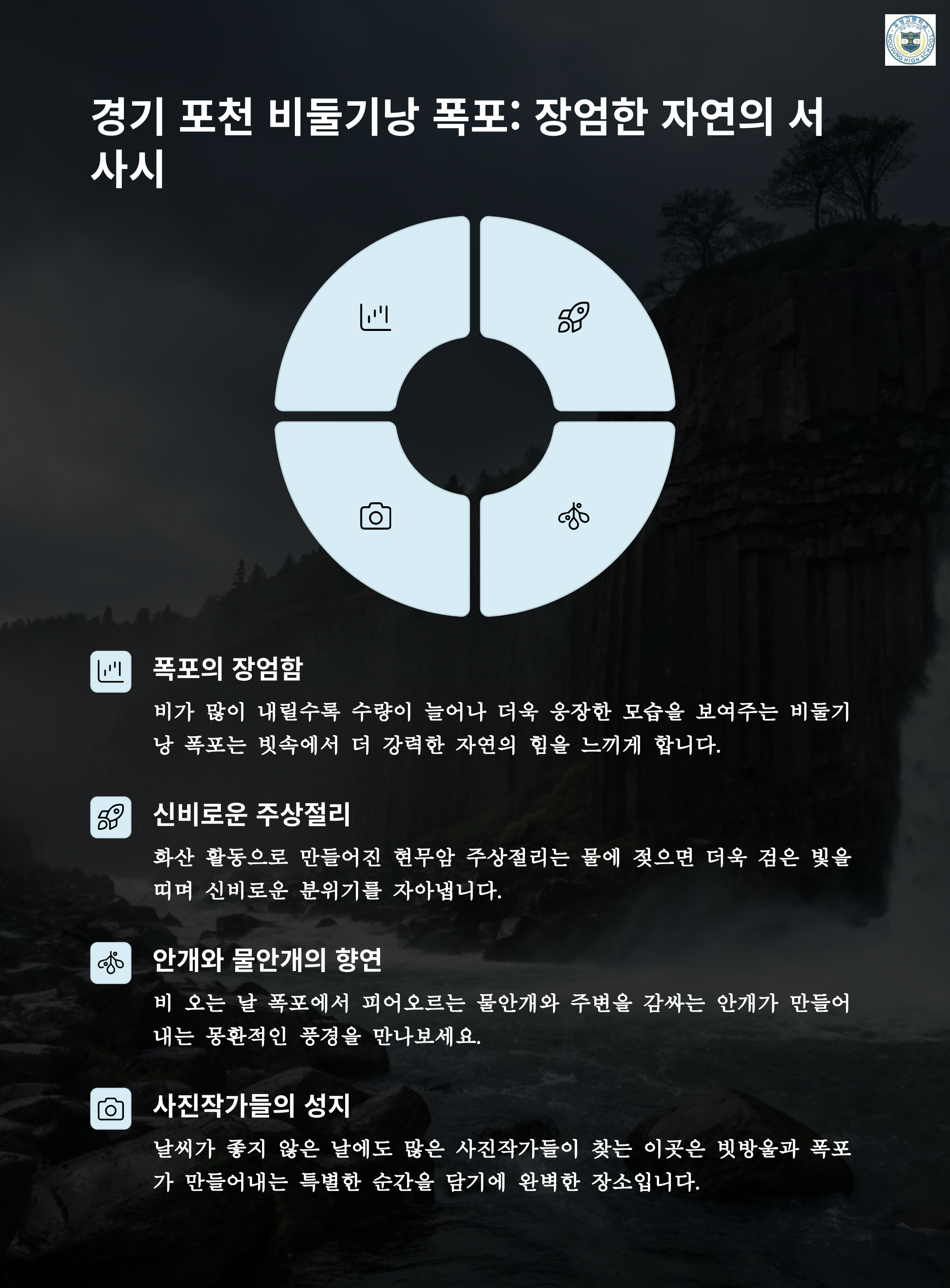 현무암 주상절리와 어우러진 폭포의 물줄기가 빗속에서 더욱 장엄한 풍경을 연출합니다. 자연이 만들어낸 예술 작품을 감상해보세요.