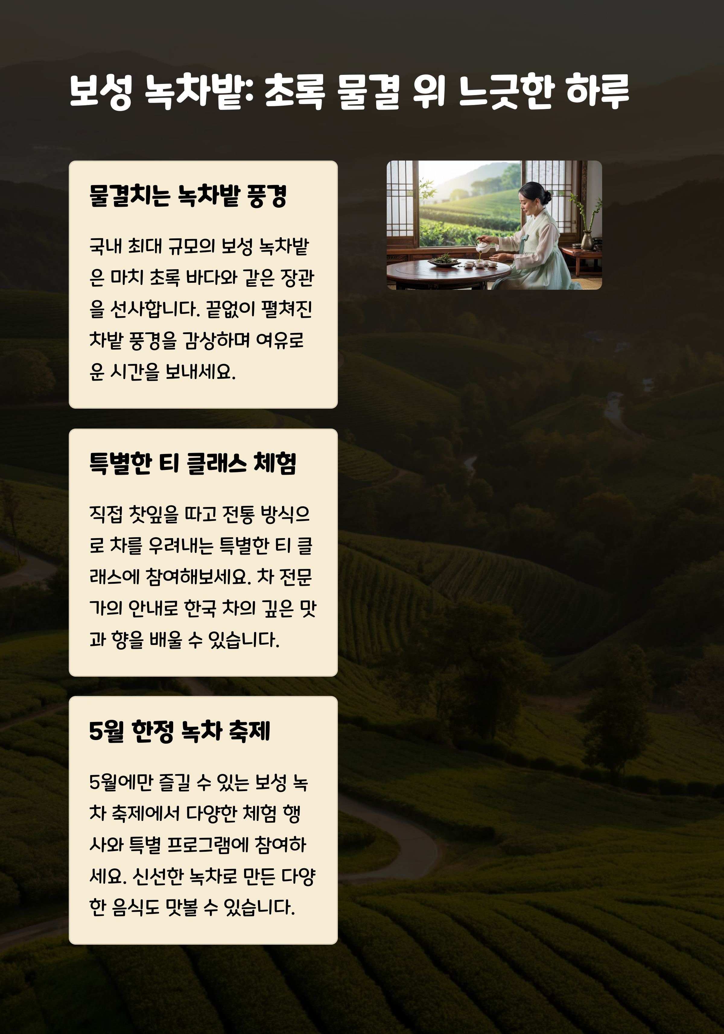 💡 인사이더 정보: 5월 둘째 주 주말에는 보성다향대축제가 열려 다양한 차 체험과 공연을 즐길 수 있어요!