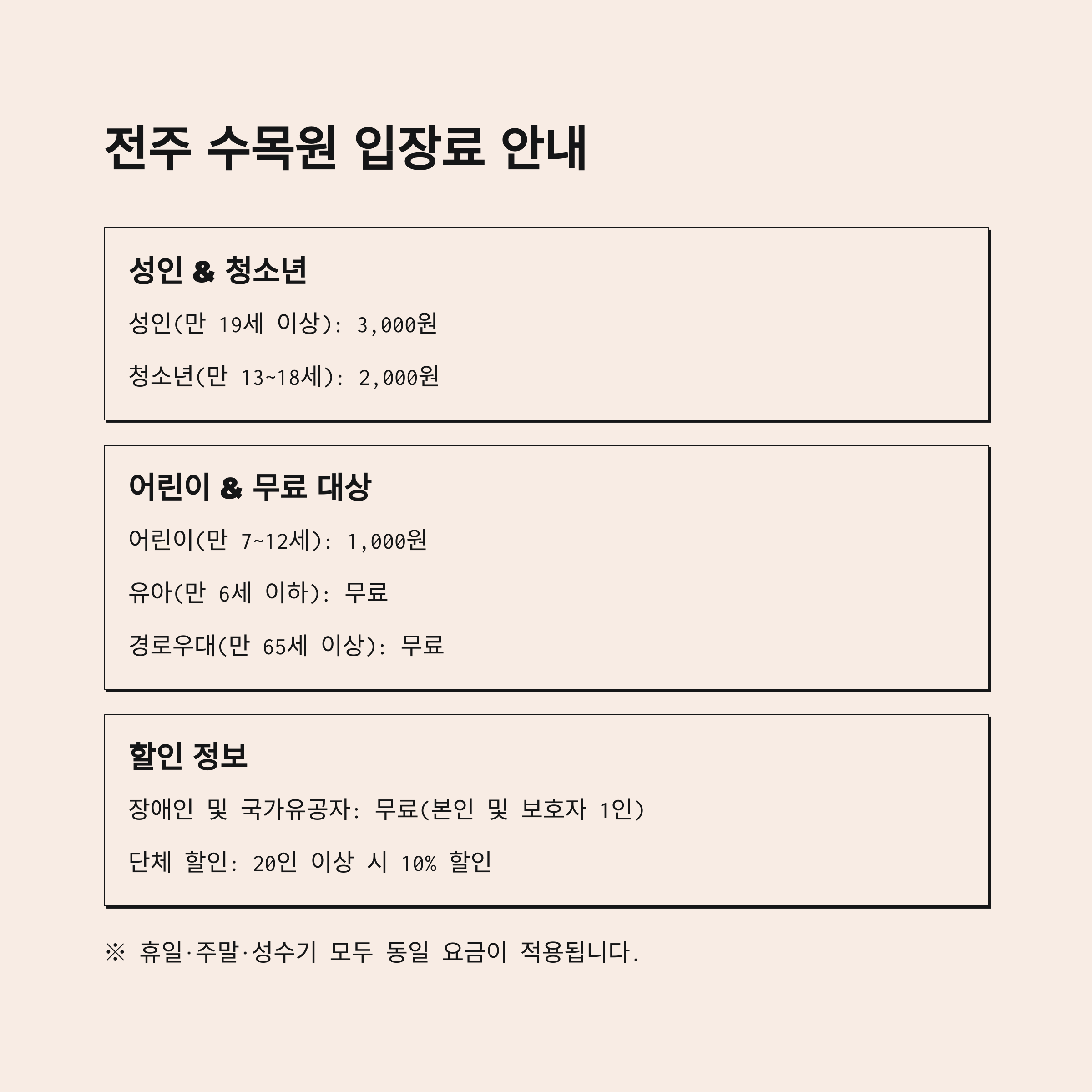 전주 수목원 입장료는 성인·청소년·어린이 기준으로 합리적으로 책정되어 있습니다.