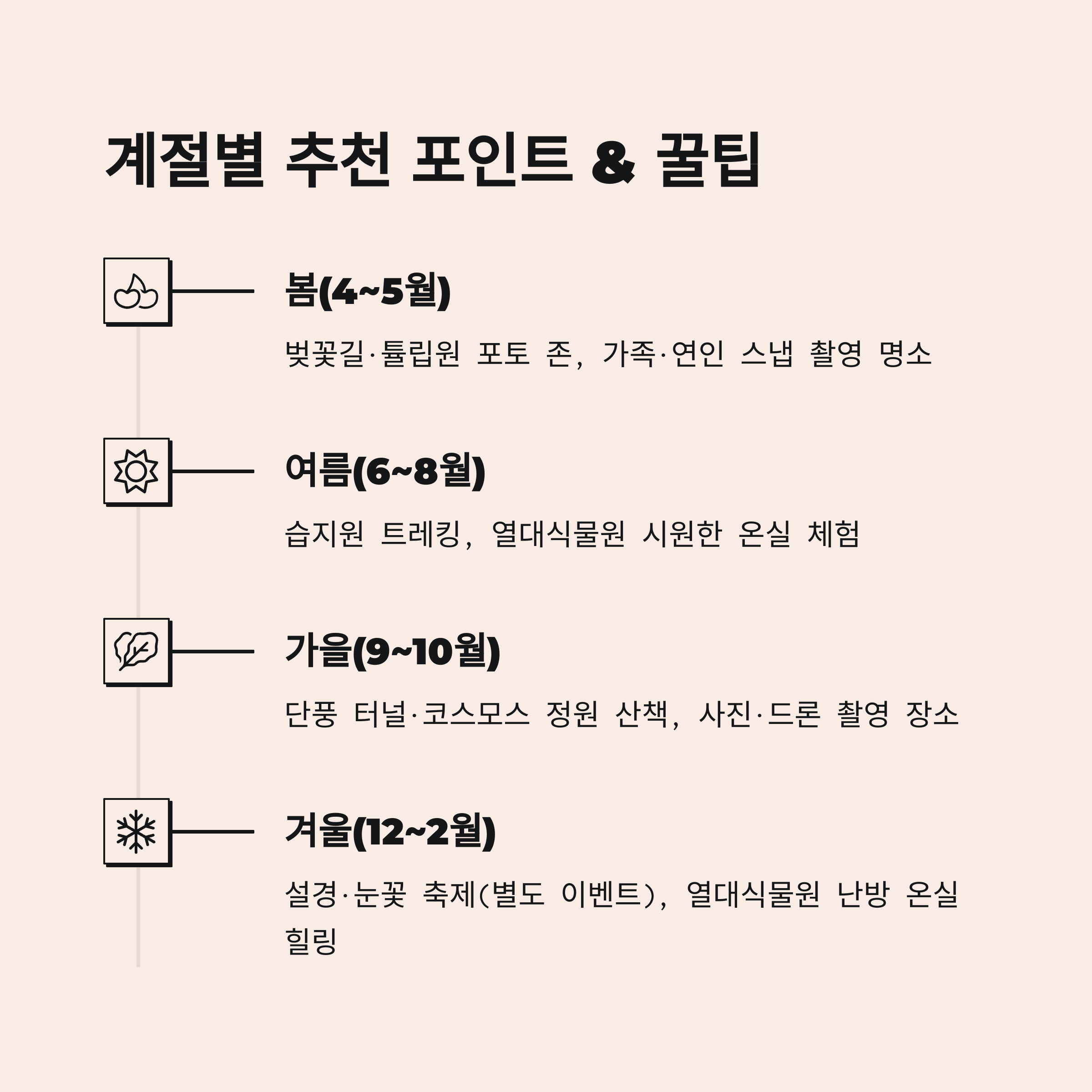 - 겨울(12~2월): 설경·눈꽃 축제(별도 이벤트), 열대식물원 난방 온실 힐링