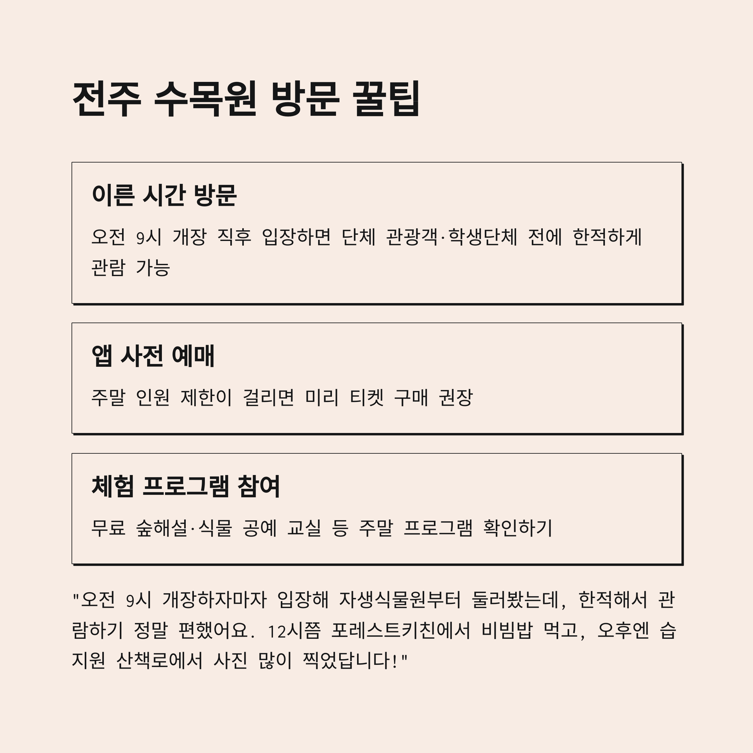 오늘은 전주 수목원 입장료와 함께 운영 시간, 가는 법, 구역별 볼거리, 방문 꿀팁을 모두 정리해 드렸습니다.