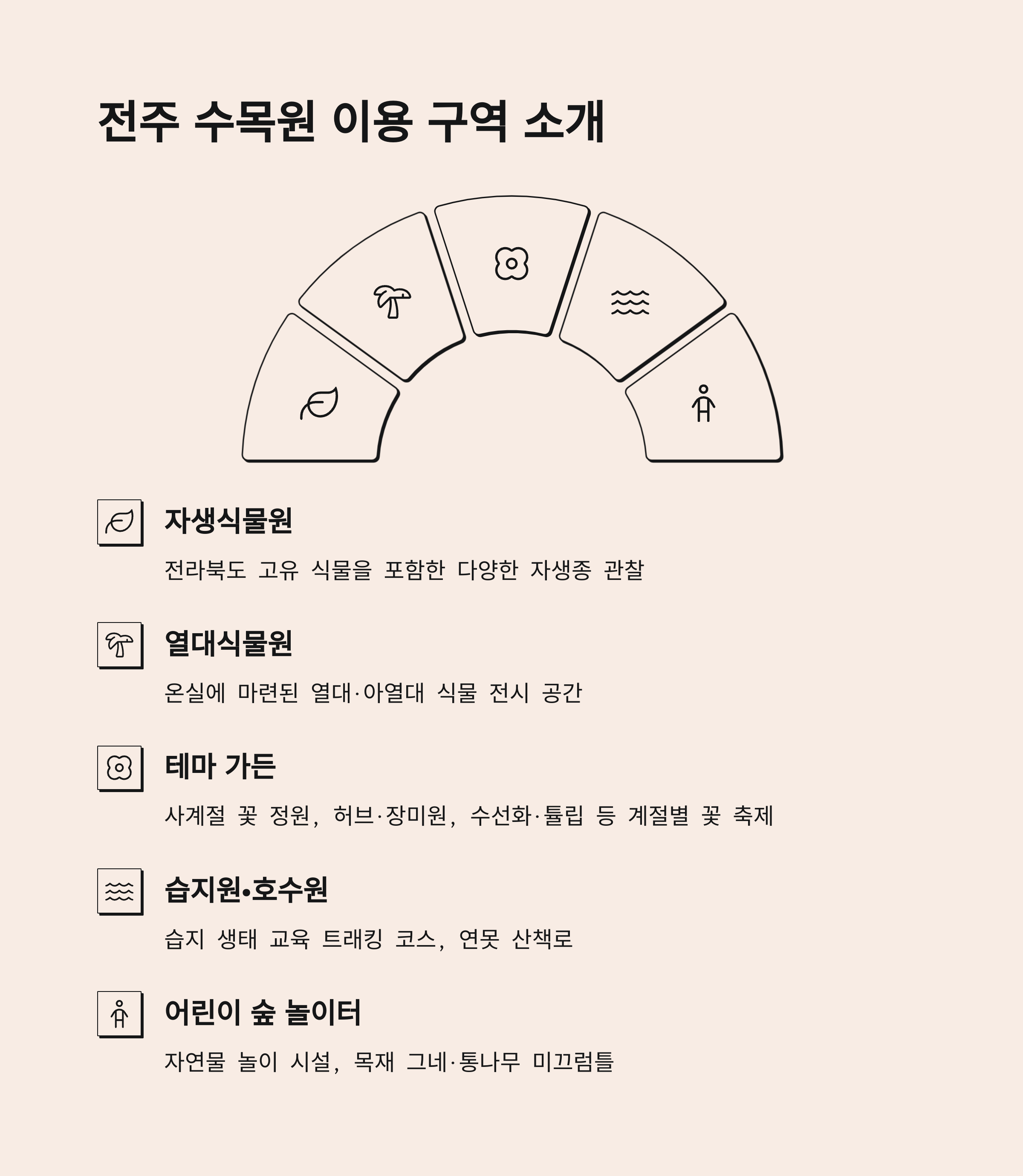 전주 수목원은 크게 5개 구역으로 나뉘어 있어, 각각 다른 테마의 숲과 꽃, 체험 시설을 즐길 수 있습니다.