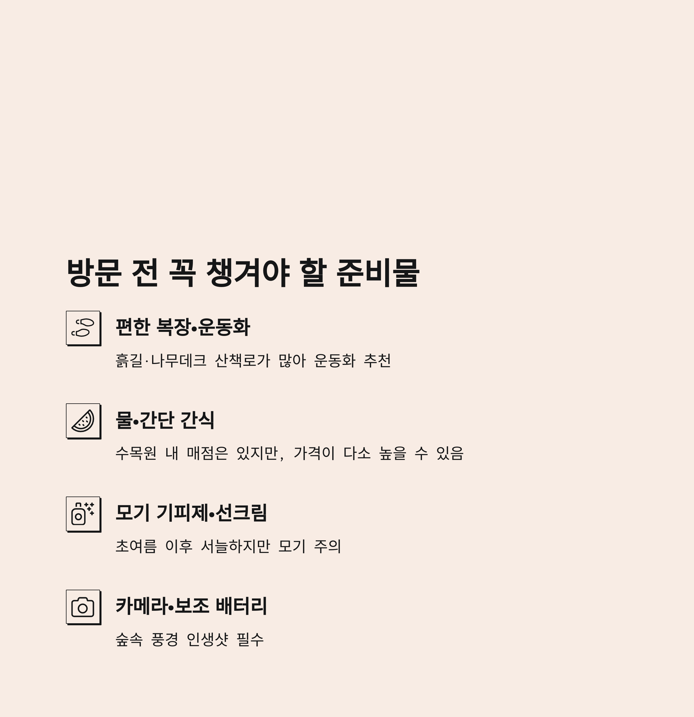 - 물·간단 간식: 수목원 내 매점은 있지만, 가격이 다소 높을 수 있음