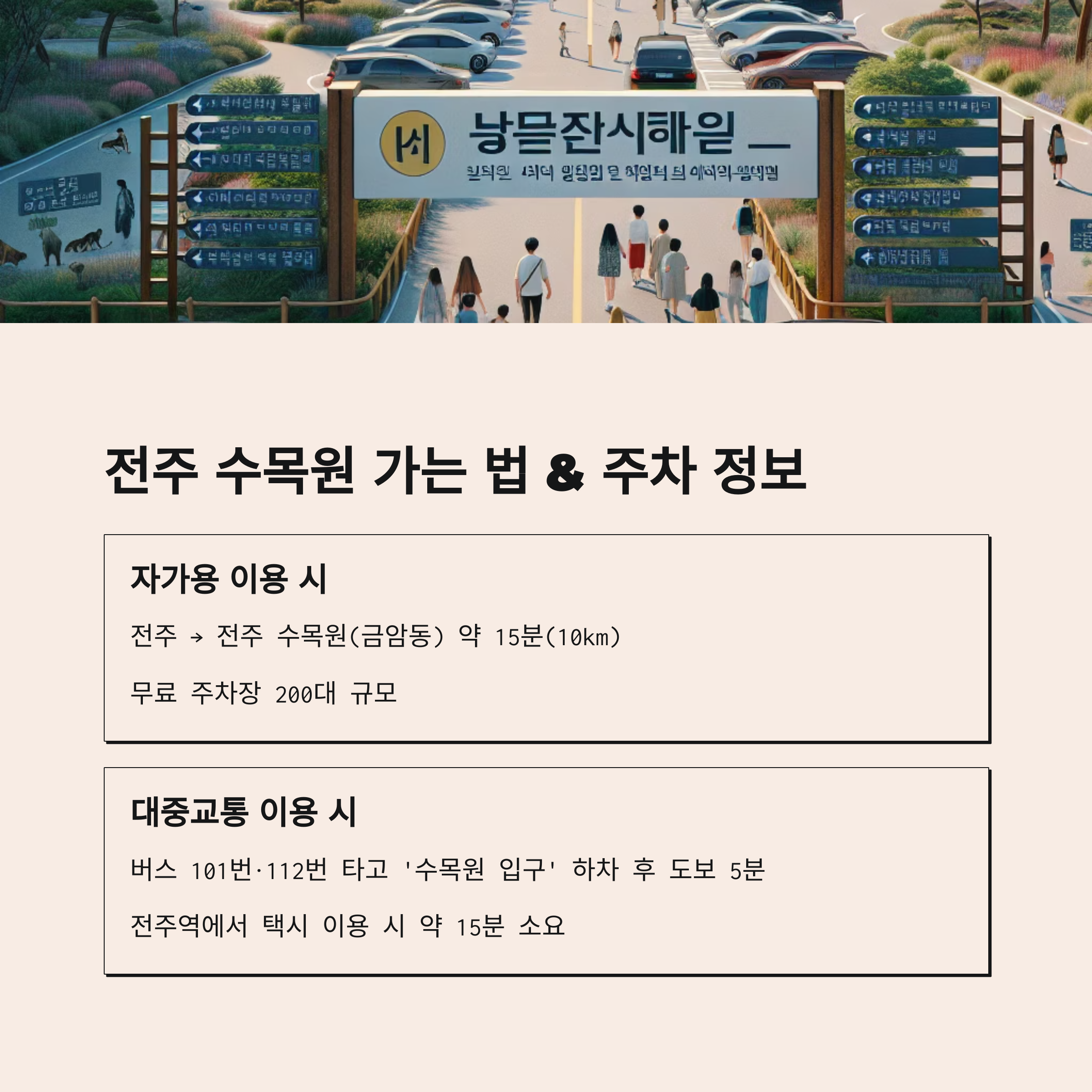 - 자가용 이용 시: 전주 → 전주 수목원(금암동) 약 15분(10km)