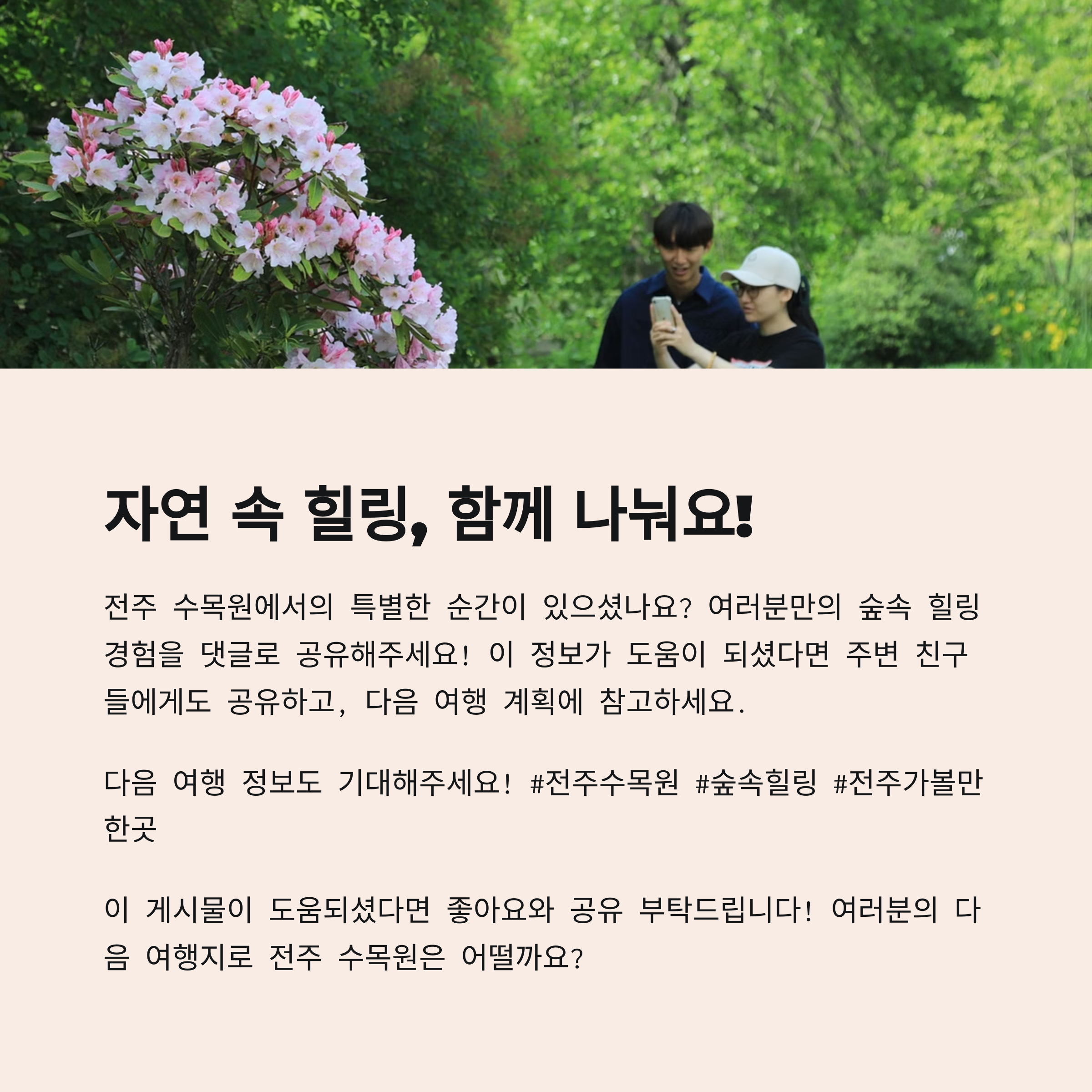 자연 속에서 마음의 피로를 풀고 싶다면, 전주 수목원에서 시원한 숲바람과 함께 여유로운 하루를 보내 보세요.