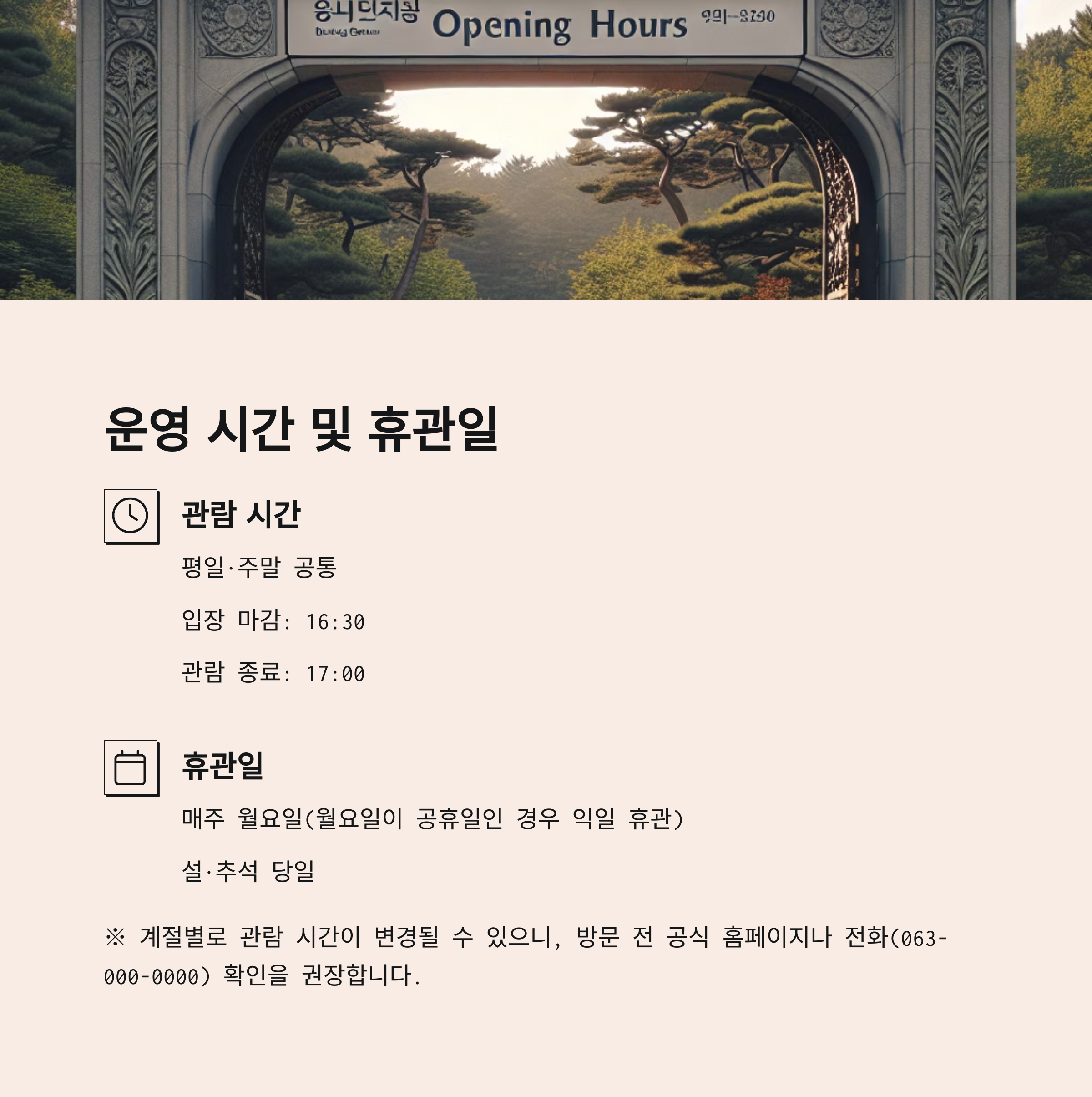 ※ 계절별로 관람 시간이 변경될 수 있으니, 방문 전 공식 홈페이지나 전화(063-000-0000) 확인 권장
