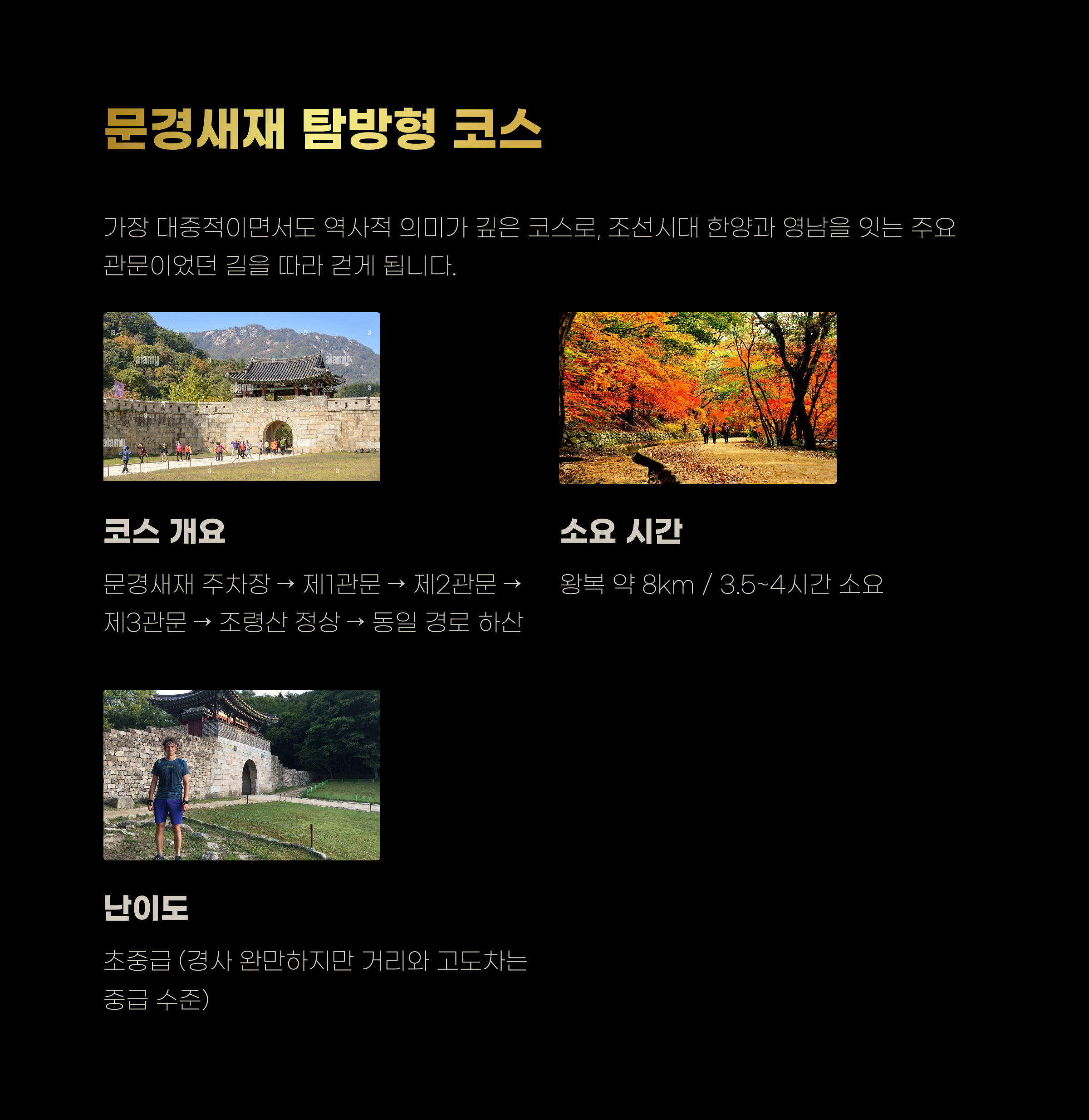 - 출발지: 문경새재 주차장 (문경시 문경읍 새재로 932)