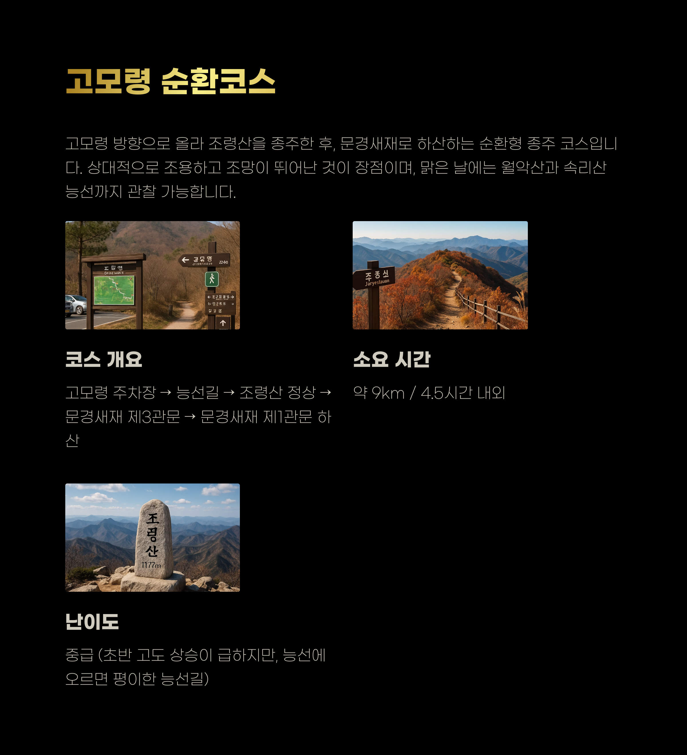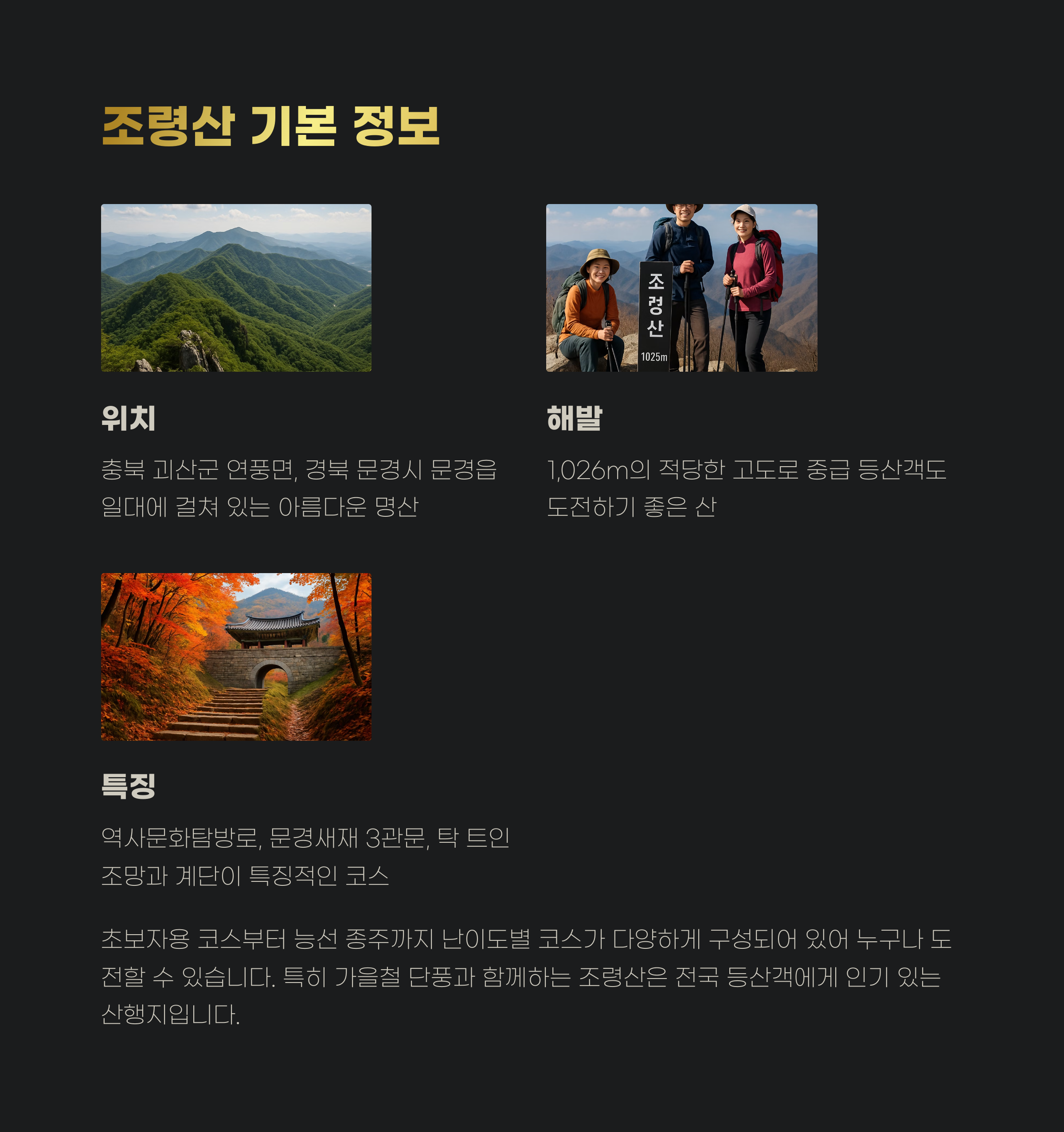 특히 가을철 단풍과 함께하는 조령산은 전국 등산객에게 인기 있는 산행지이며, 초보자용 코스부터 능선 종주까지 난이도별 코스가 다양하게 구성되어 있어 누구나 도전할 수 있습니다.