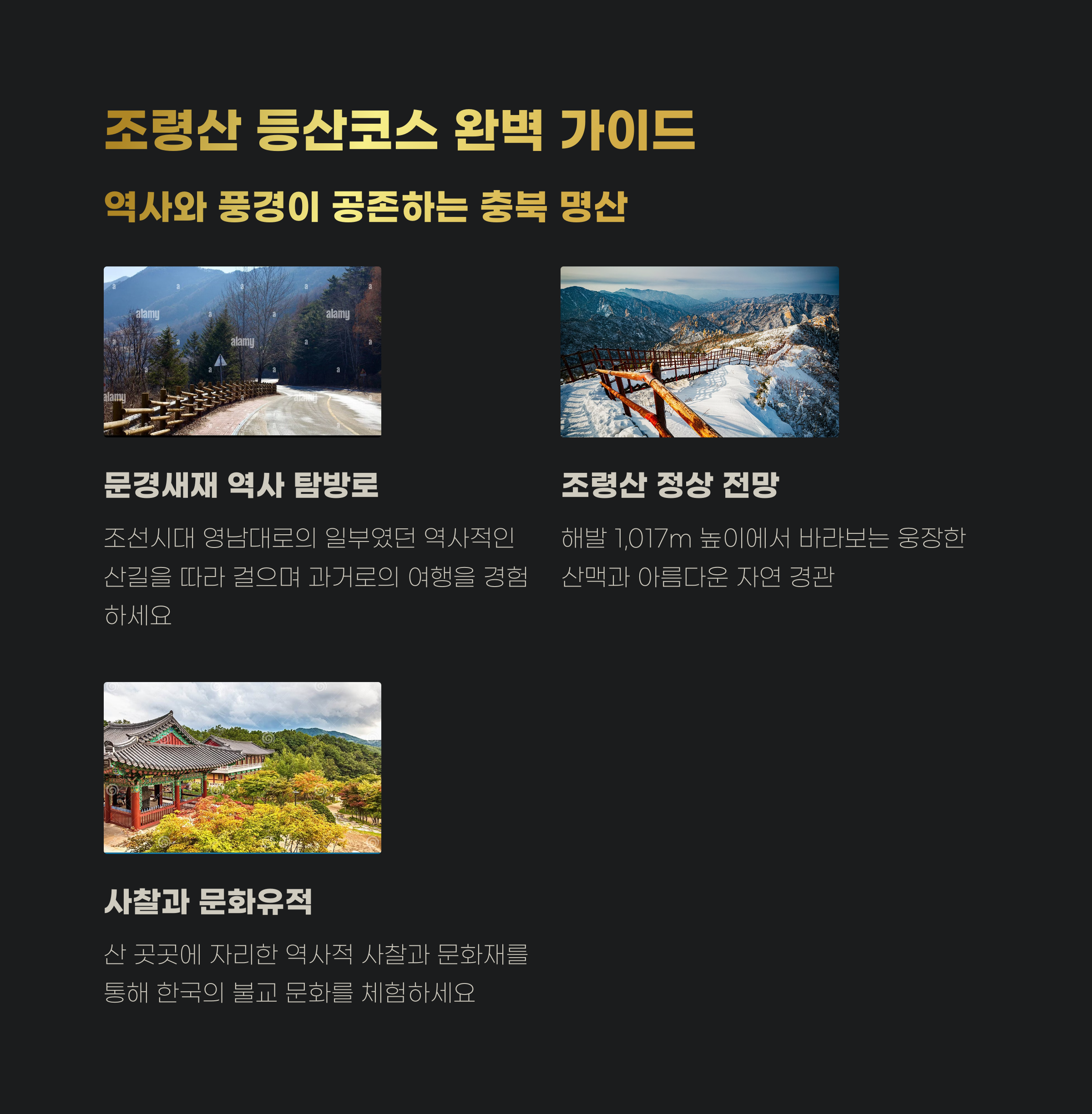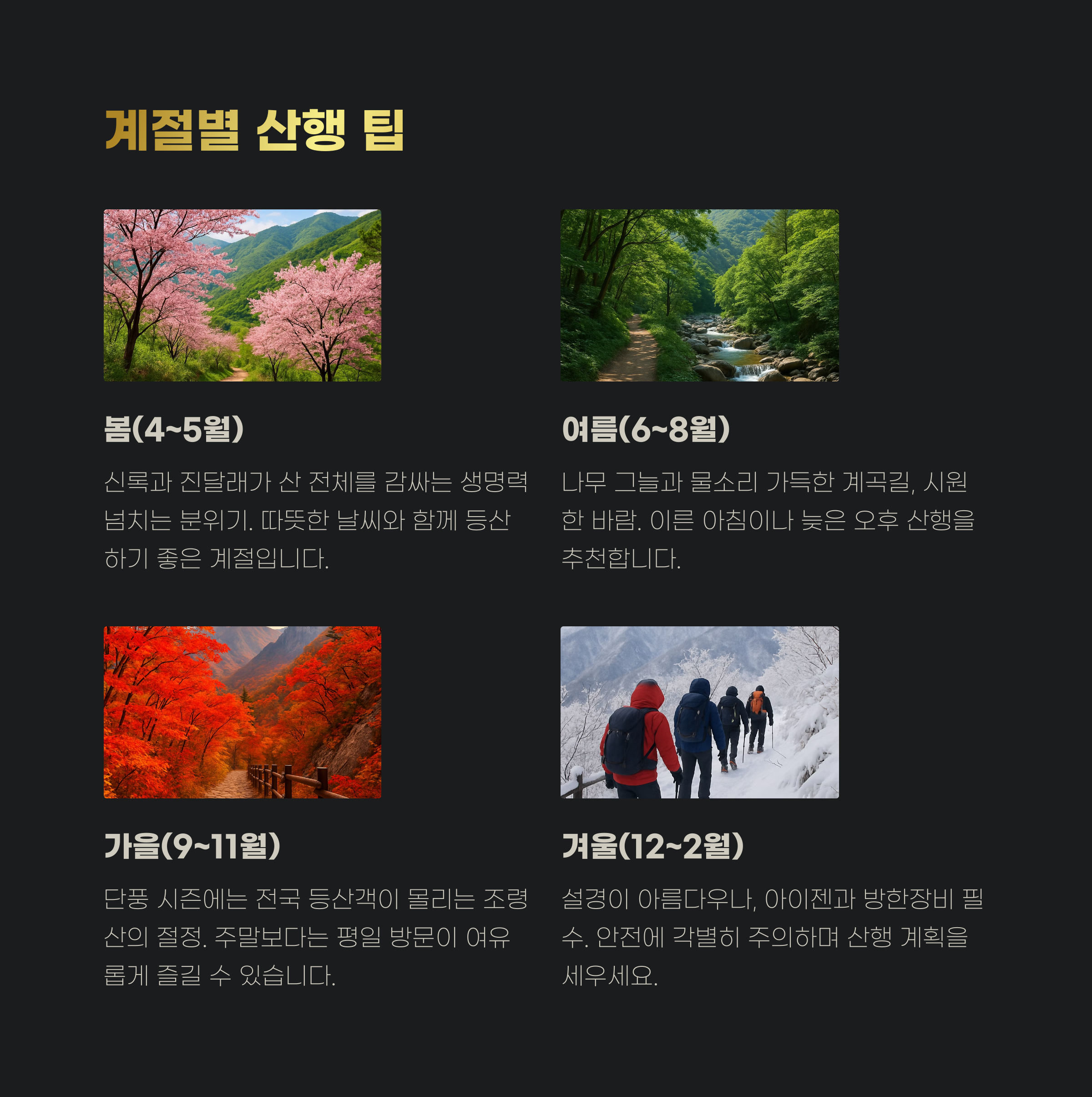 - 가을(9~11월): 단풍 시즌에는 전국 등산객이 몰리는 조령산의 절정