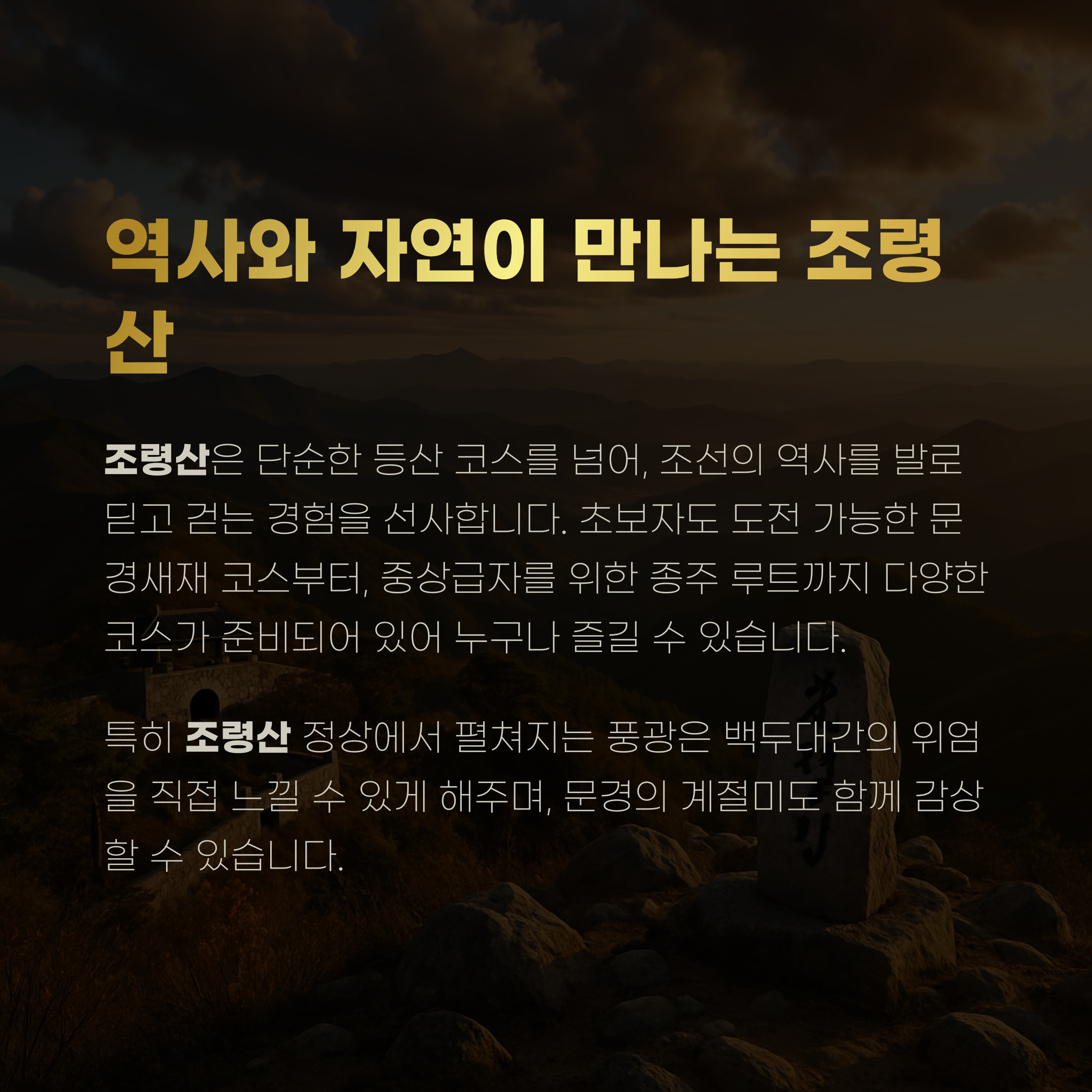 조령산은 단순한 등산 코스를 넘어, 조선의 역사를 발로 딛고 걷는 경험을 선사합니다. 초보자도 도전 가능한 문경새재 코스부터, 중상급자를 위한 종주 루트까지 다양한 코스가 준비되어 있어 누구나 즐길 수 있습니다. 특히 조령산 정상에서 펼쳐지는 풍광은 백두대간의 위엄을 직접 느낄 수 있게 해주며, 문경의 계절미도 함께 감상할 수 있습니다.