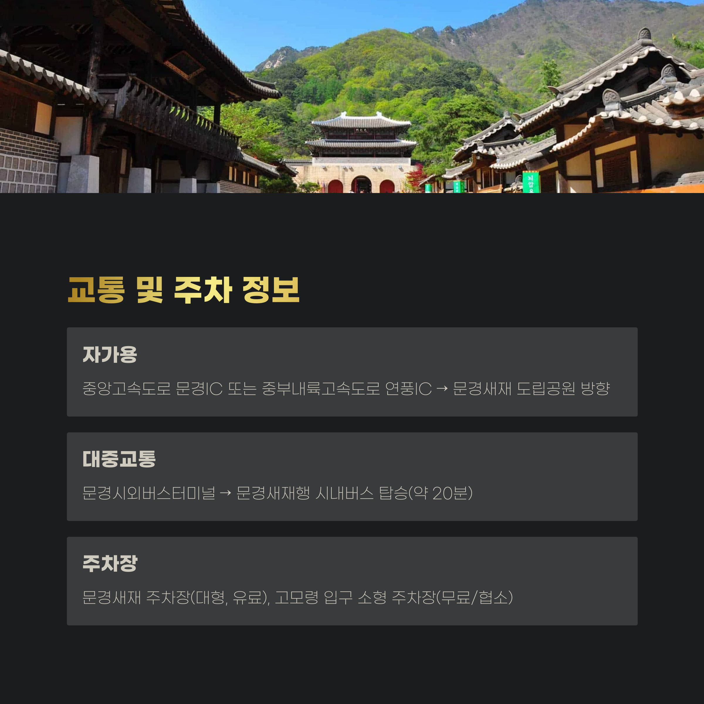 - 대중교통: 문경시외버스터미널 → 문경새재행 시내버스 탑승(약 20분)