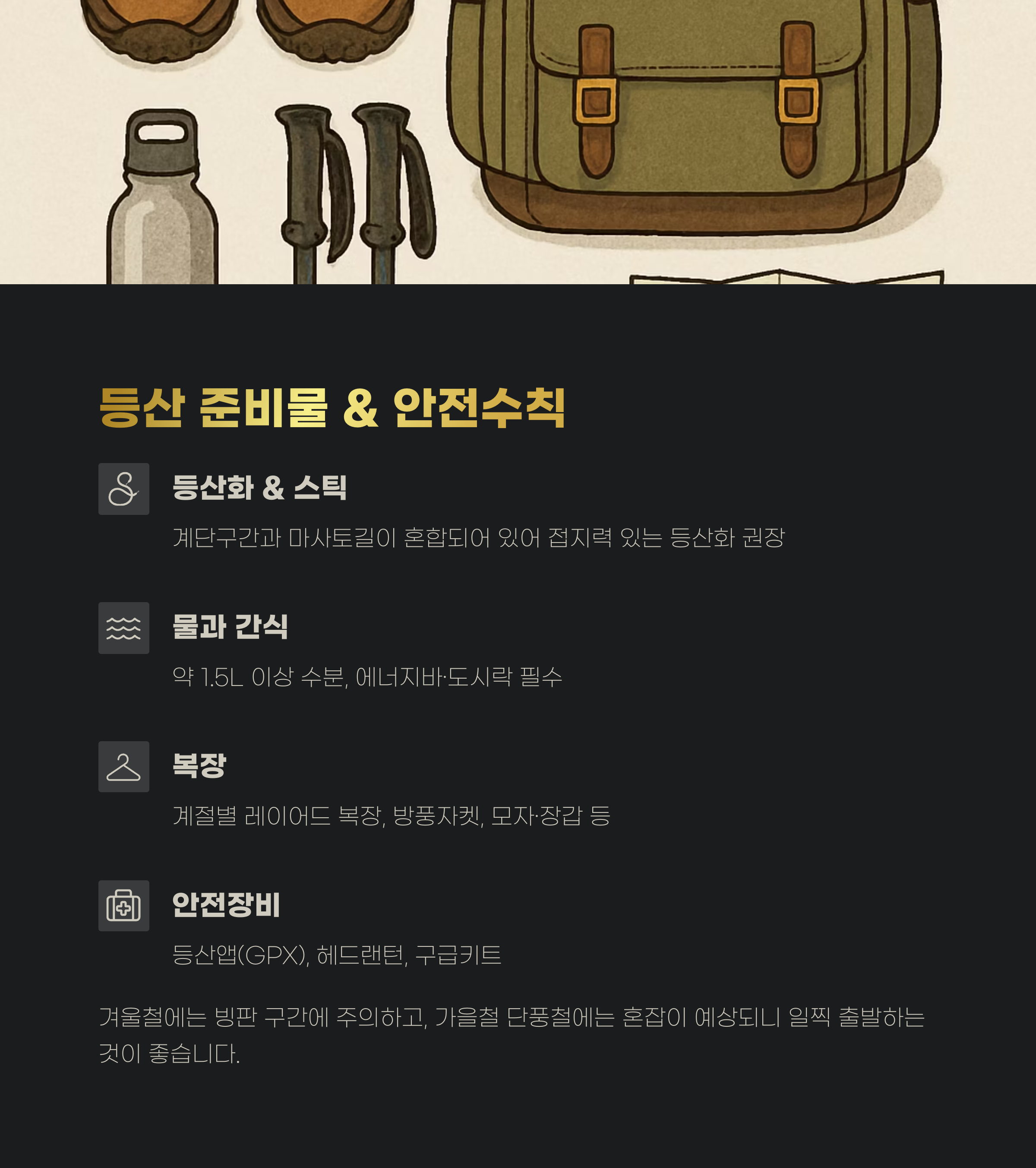 - 안전장비: 등산앱(GPX), 헤드랜턴, 구급키트